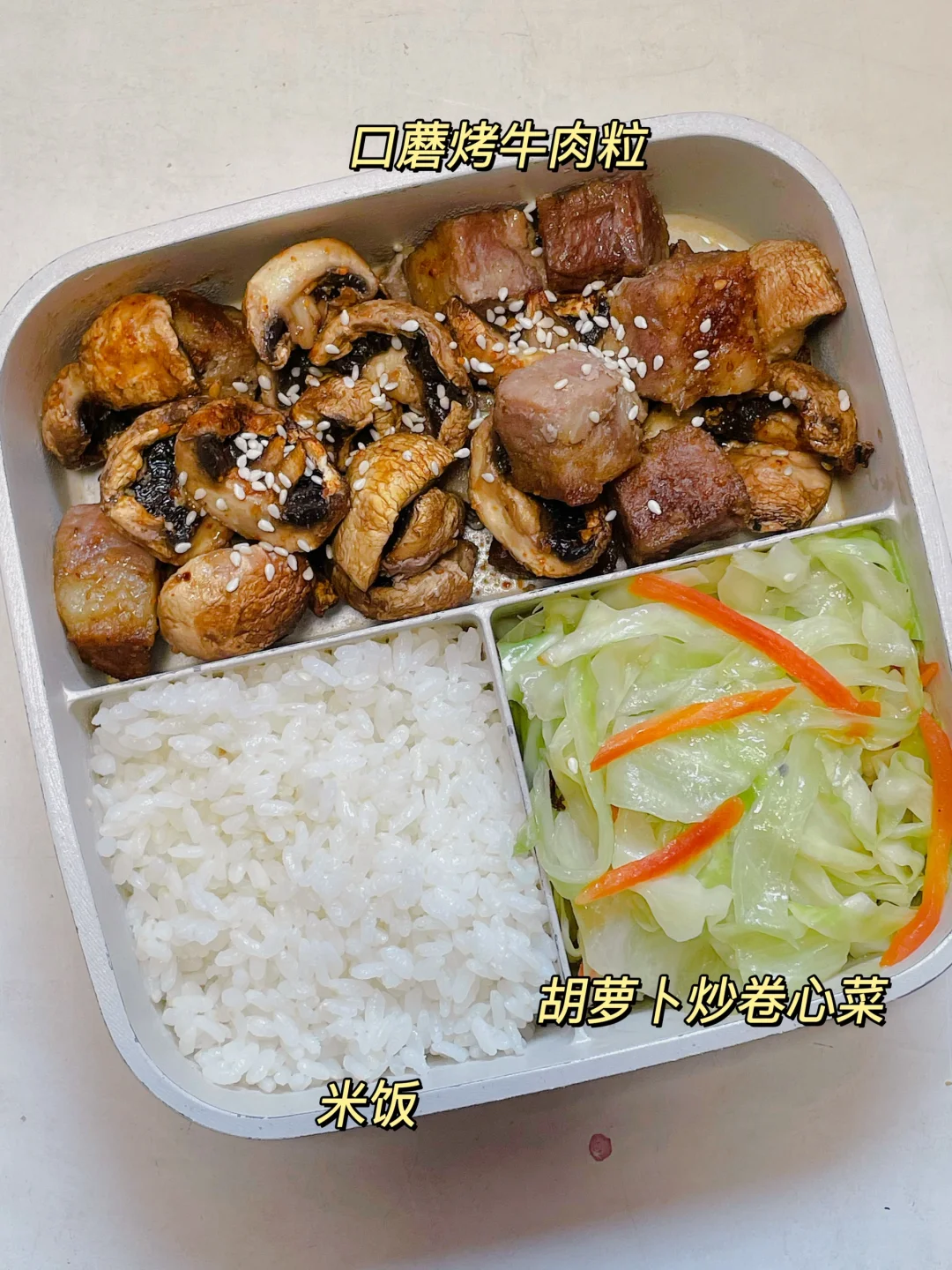 📍米饭+胡萝卜炒卷心菜+口蘑烤牛肉粒