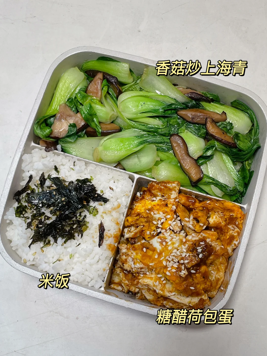 📍米饭+糖醋荷包蛋+香菇炒青菜