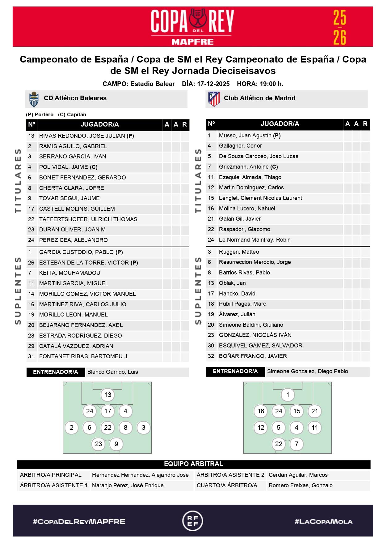 虎扑12月17日讯北京时间12月18日凌晨2时,2025-26赛季西班牙国王杯1/16决赛,巴利阿里竞技与马德里竞技在巴利阿里球场展开对决。赛前双方公布了本场比赛的首发名单。