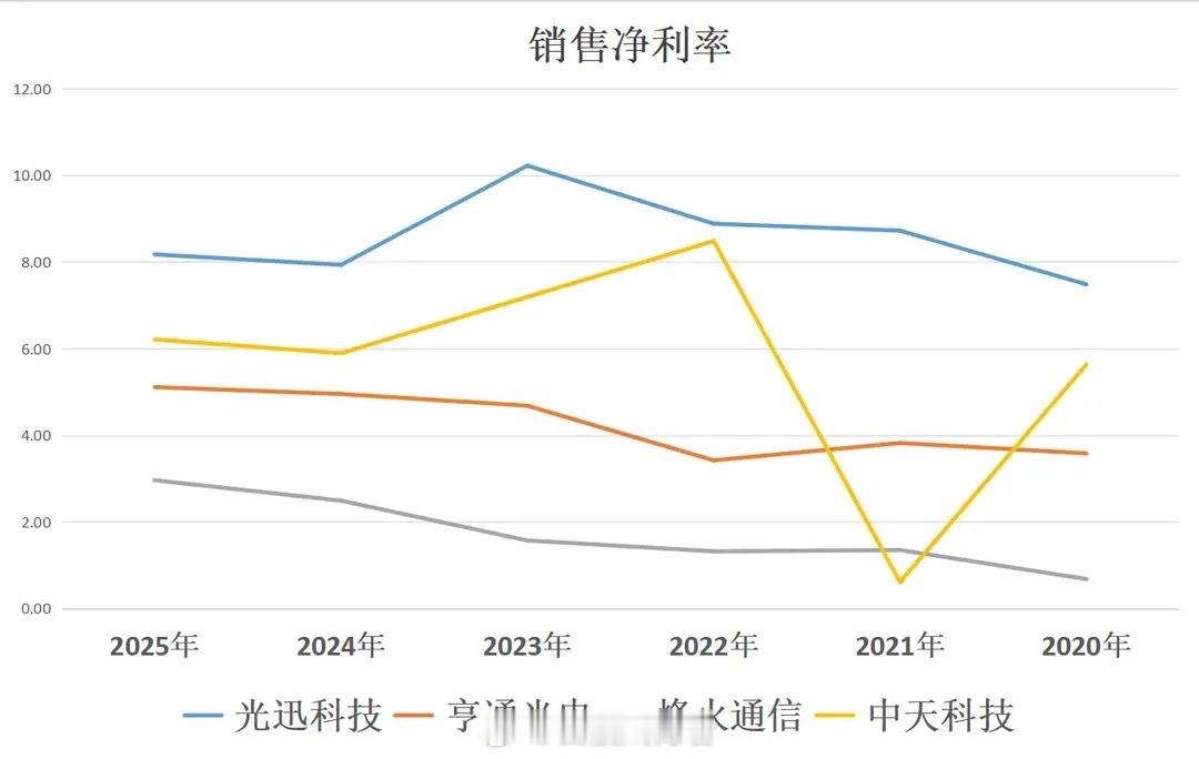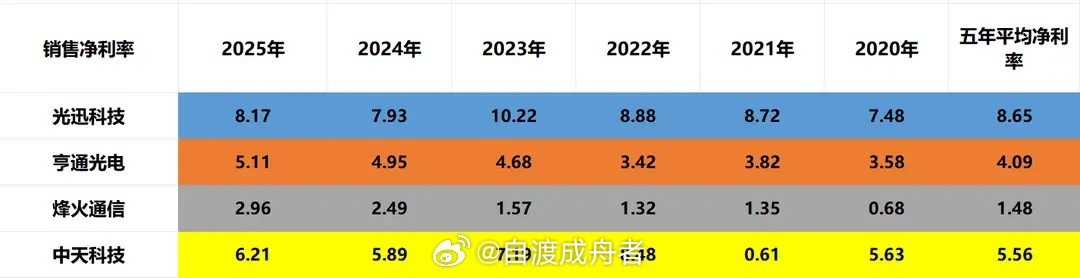 光通信补涨行情中,光迅科技、亨通光电、烽火通信、中天科技这四家各有看点,谁能成为“补涨老大”,不妨从核心优势和财务韧性两方面拆解看看:光迅科技是光器件领域的“隐形冠军”,深耕行业近50年,全球竞争力稳居前四,国内第一,产品出货量常年领跑。三季报净利率在四家之中最高,1.6T光模块已量产、3.2T在研,技术硬实力突出,只是业务规模稍小,财务杠杆最低,靠利润“硬撑”收益,稳健有余但扩张感稍弱。亨通光电则是“全产业链玩家”,光纤通信和海缆全球前三,还是国内唯一能做跨洋光缆工程的企业,资产周转速度最快,净资产收益率以7.72%居首。靠着高效周转和适度杠杆,把“海洋通信”的长板拉得很开,进攻性更足。烽火通信作为“国家队”,最独特的是打通了海洋通信全链条技术,从芯片到海缆工程全自主,这点全球独一份。不过目前净利率和周转率稍显落后,更多靠财务杠杆支撑收益,后续若能在盈利端发力,潜力不小。中天科技胜在“全面无短板”,光电缆品种最全,还悄悄在量子通信领域搞出了全球首次验证的成果,储能业务也冲到了全球第八。各项财务指标均衡,没明显弱点,属于“稳扎稳打型”。要是偏好技术领跑和稳健性,光迅科技值得关注;想抓产业链整合力强、进攻性强的,亨通光电更具爆发力;看好海洋通信独家技术的,烽火通信有不可替代性;喜欢均衡布局的,中天科技的综合实力不容忽视。你更倾向哪类风格呢?