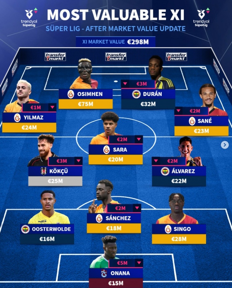前锋:萨内(2300万欧,加拉塔萨雷)、杜兰(3200万欧,费内巴切)、奥斯梅恩(7500万欧,加拉塔萨雷)、巴勒什·伊尔马兹(2400万欧,加拉塔萨雷)