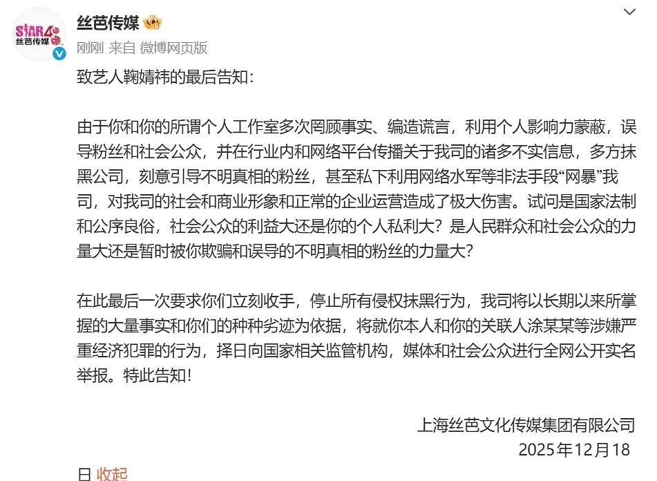 郭敬明和王一栩现在估计要疯了! 鞠婧祎可能要铁窗泪了,原经纪公司丝芭放出大杀招:公开表示鞠婧祎和关联人涂某某有【严重经济犯罪】,估计这是实打实说税有问题了吧,就说了,公开工资待遇只是开胃菜,现在估计还有更猛的黑料 丝芭这么做肯定是因为不想真毁掉这么一棵摇钱树,但是树非要跑,那就只能鱼死网破。 早期内娱艺人都不干净,那个时候避s很多都是不干净的,真的一抓一个准,不然为啥这么多艺人解约最后都是争取和平解约,公司怎么可能没有点底牌。 前面丝芭发声明,鞠婧祎在7年里赚了1.39亿 ,给她租了上海外滩大平层,配了奔驰房车和司机,还投资1.6亿让她带资进组拍了《芸汐传》,甚至平时和闺蜜出去旅游都给报销了。 而鞠婧祎是第二批,后来签约时间影视约都是20年,她自己也知道,但是还是坚持解约,甚至接着又拍了三部剧,郭敬明一部,王一栩两部。 我感觉闹到这个程度,已经不是说他们想停就能停的了,都已经上升到经济的层面了,已经不仅仅是当事人,双方的合约问题了啊,需要给社会层面一个交代了