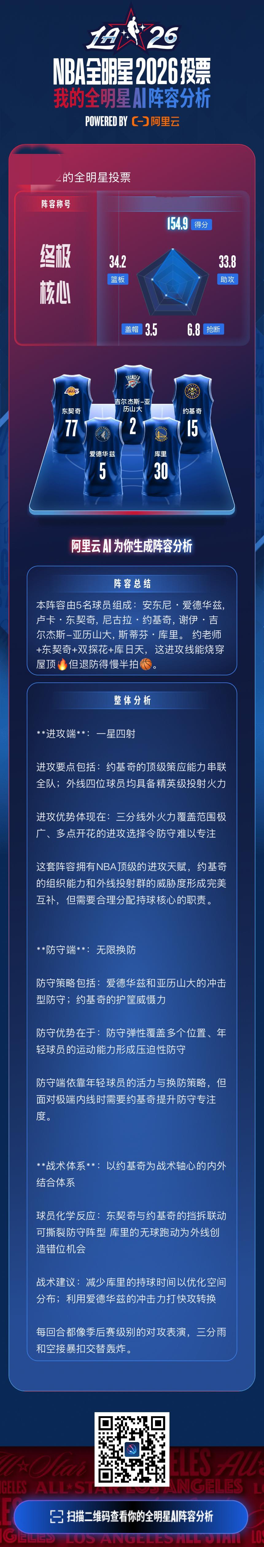 阿里云AI阵容分析阿里云AI助力NBA全明星投票今天投票让我比较惊喜的是新增的这个阿里云AI阵容分析功能。它在评估我的阵容的时候,会从进攻段、防守端进行分析,既列出优势也提出劣势。视角很全面,分析也客观——毕竟篮球是五个人的运动,战术配合根本少不了。这功能也算是让全明星投票从娱乐向真正的篮球讨论靠近,极大改善了我们球迷投票的体感啊!