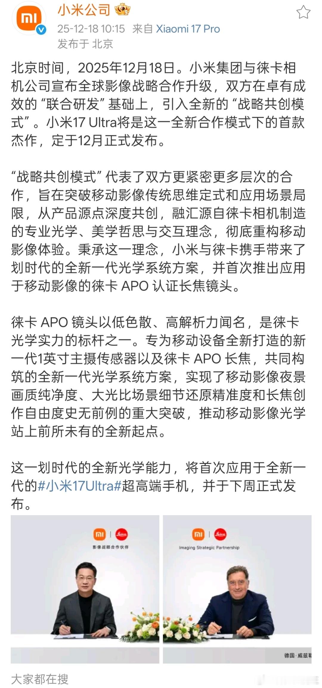【小米17 Ultra定档,徕卡红标真要来了?】小米17Ultra发布时间定档 发布时间终于敲定!官方预告合作再升级,最炸裂的无疑是:期待三年的「徕卡红标」版,这次稳了? 🚨所以如果红标成真,专属徕卡水印、专业影像套装大更新几乎板上钉钉!再就是徕卡最经典的胶片模拟滤镜能不能有机会安排上?那可就是"这真徕卡"的具象化了!最后就看价格了,涨价似乎是必然的了,毕竟小红标一上,身家立马不一样,大概率是要破万了