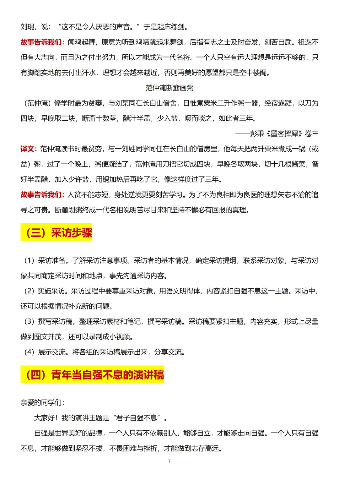 2、《君子自强不息》: 积累好自强不息的名言,还要熟记诚信相关的两个相关典故:《祖逖闻鸡起舞》《范仲淹断齑画粥》。要知道典故讲了什么,对我们的启发是什么,常常会考问答题。常考的还有“青年当自强不息”的演讲稿。