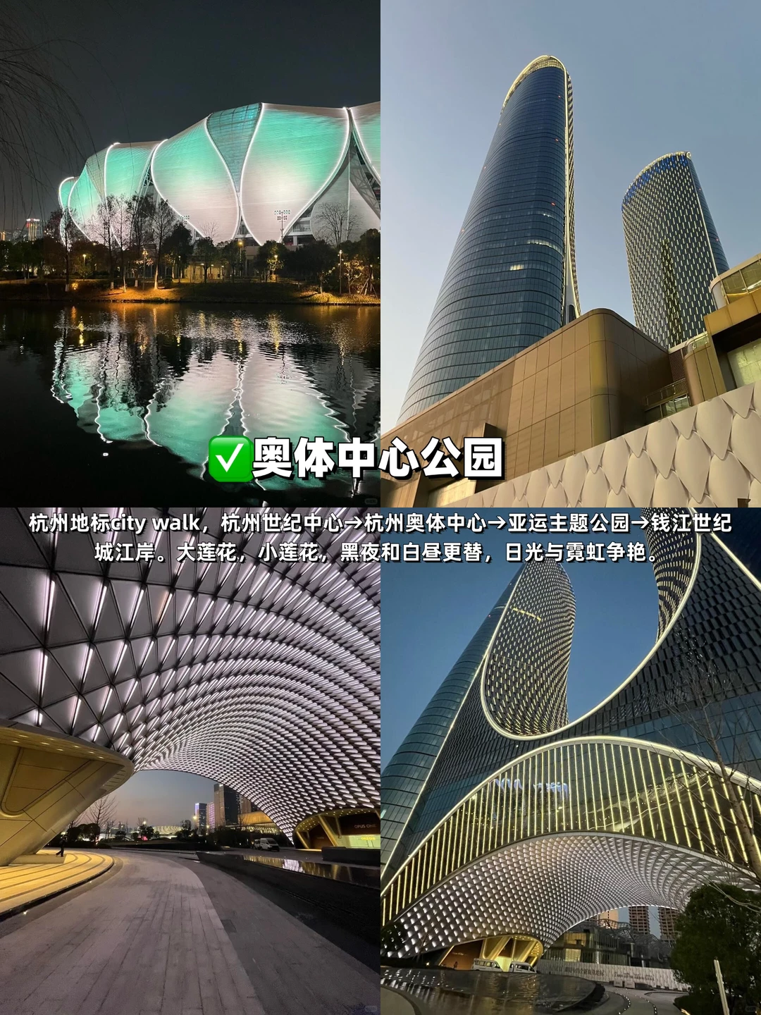 大莲花、小莲花建筑超震撼,白天看城市天际线,晚上灯光亮起氛围感拉满,亚运主题公园也超好逛
