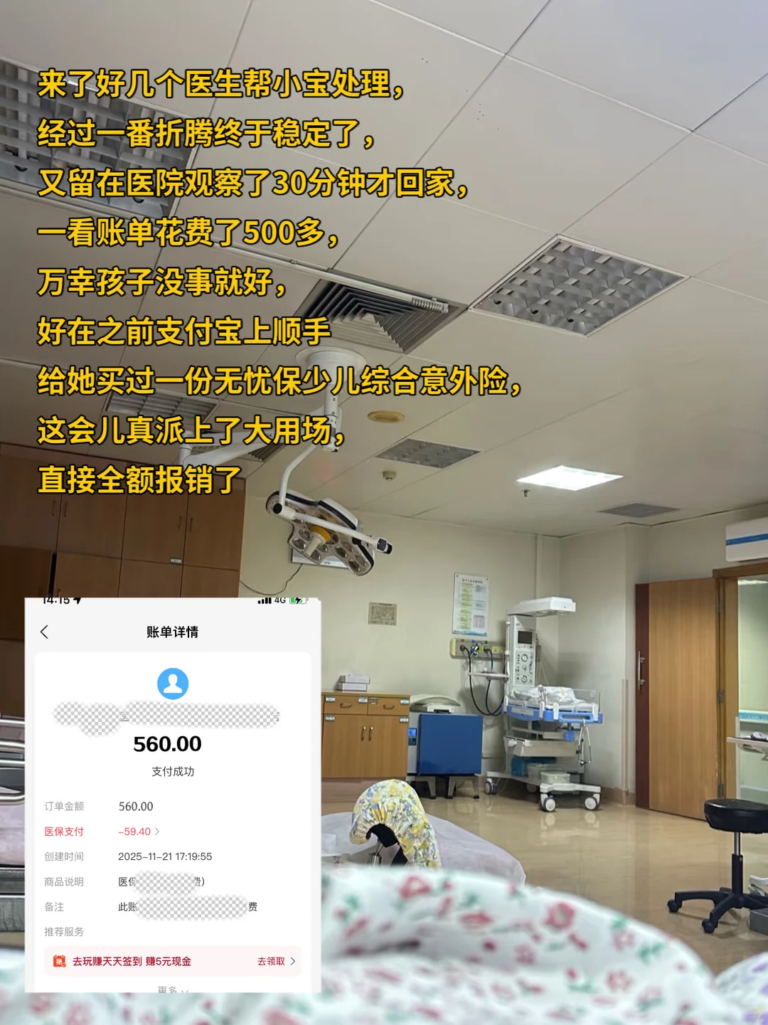 检查后医生说是病毒引起的急性肠胃炎,开了药,叮嘱饮食要清淡。看着账单上的数字,心里沉了一下——但很快又稳住了。女儿三个月时,我在支付宝上顺手给她买过一份无忧保少儿综合意外险,一个月不到三十块,这会儿真派上了大用场,直接全额报销了