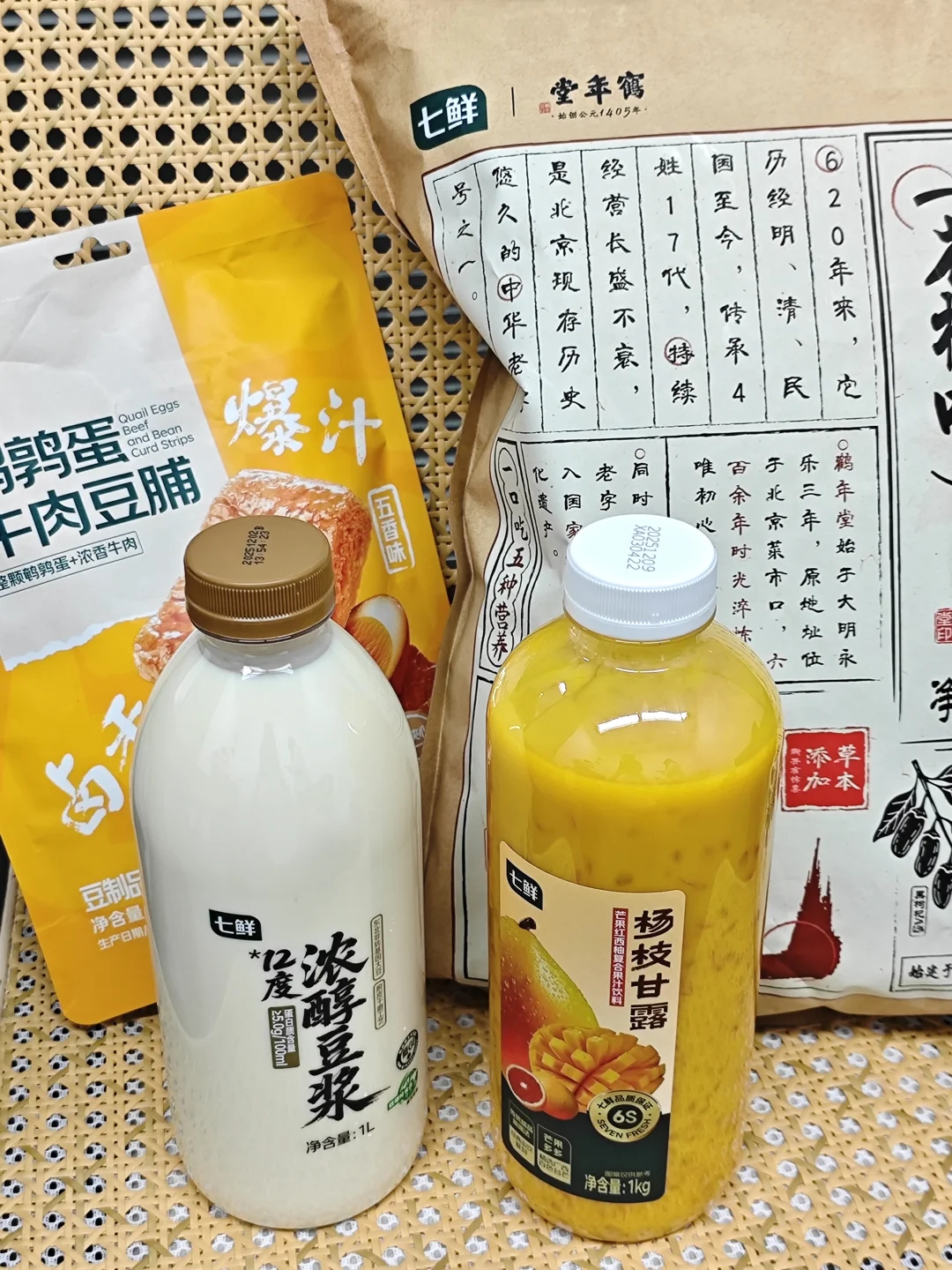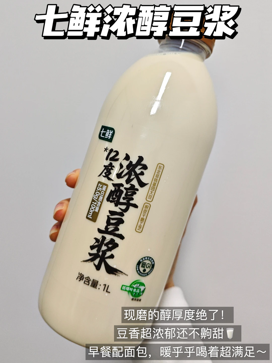 豆浆爱好党,真的巨喜欢七鲜这款豆浆,现磨的醇厚度绝了!豆香超浓郁还不齁甜🥛 早餐配面包,暖乎乎喝着超满足~