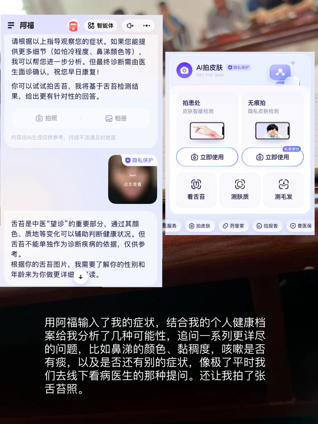 给它输入了我的症状,阿福结合我的个人健康档案给我分析了几种可能性,追问一系列更详尽的问题,比如鼻涕的颜色、黏稠度,以及是否还有别的症状,像极了平时我们去线下看病医生的那种提问。还让我拍了张舌苔照。几轮分析后告诉我是:典型风热感冒!