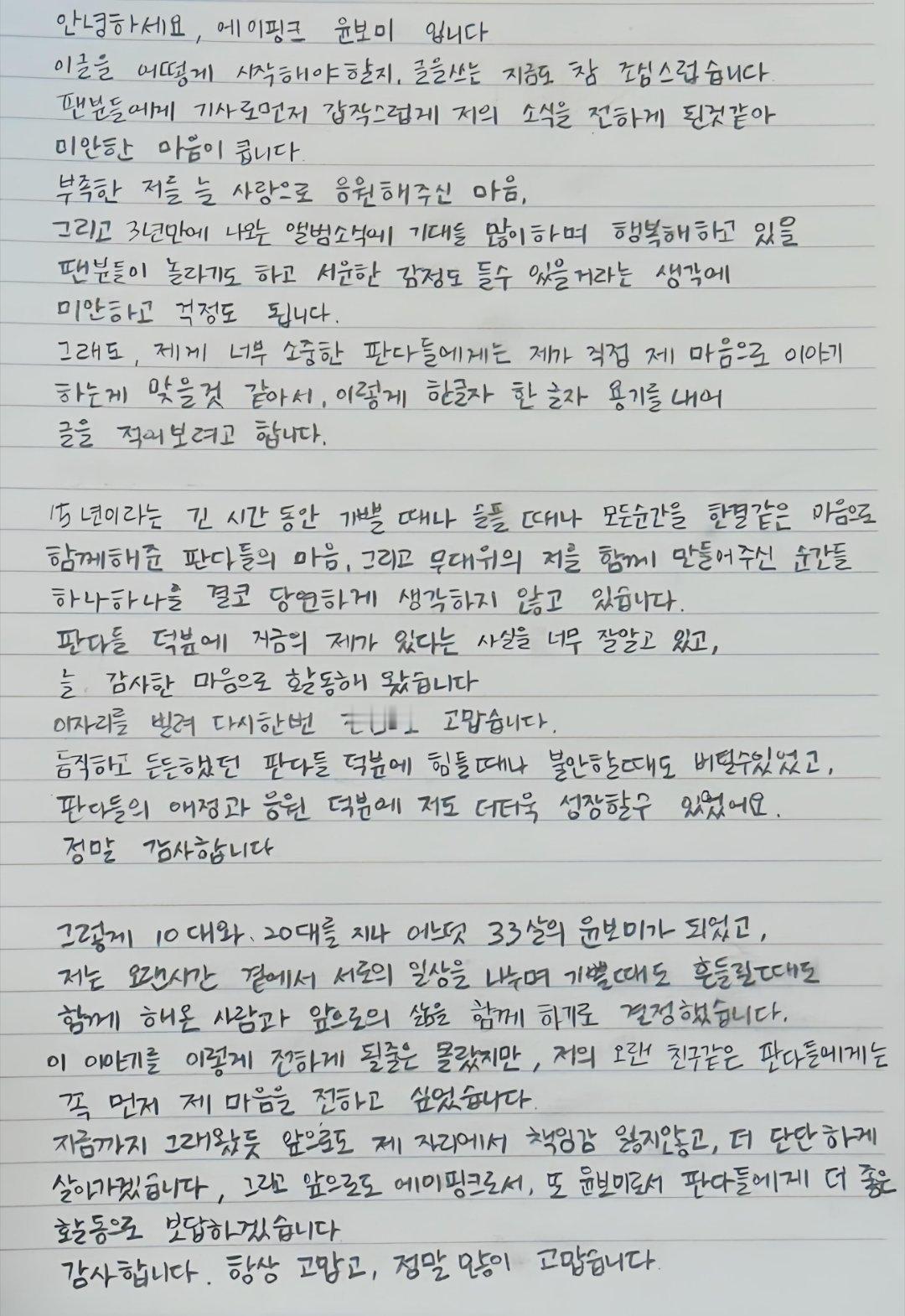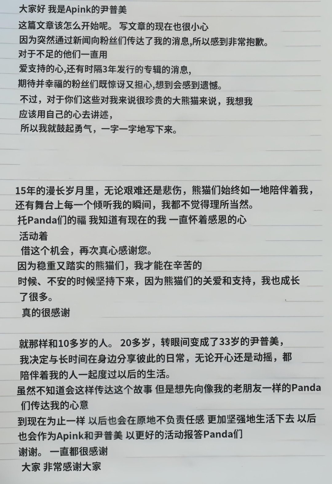 Apink尹普美宣布明年5月将与制作人Rado举行婚礼!还给粉丝写了手写信表示感谢,并且说明自己会继续活动Apink第一对结婚的,恭喜🎉感觉韩娱那边明星宣布结婚都提前通过手写信告知粉丝,都挺珍视粉丝心意的吧,尹普美这种转型演员后活动到三十多岁了还提前预告