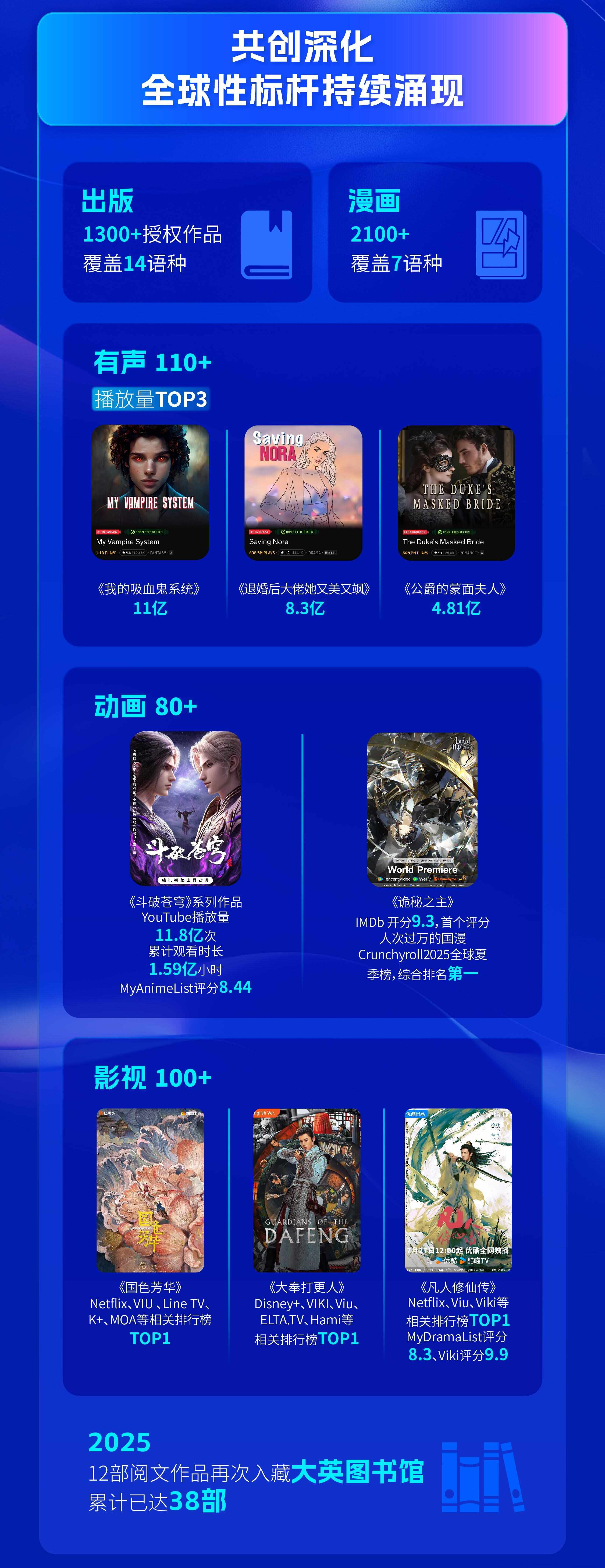 此外,就在近日,《重生之将门毒后》《第一侯》《逢晴日》《国色芳华》《惊山月》《九重紫》《九章奇案》《墨燃丹青》《为什么它永无止境》《伪像报告》《问九卿》《我花开后百花杀》等12部阅文作品,被大英图书馆收录。作为全球最大的学术图书馆之一,这也是大英图书馆自2022年以来,第三次收录阅文作品,累计已达38部。