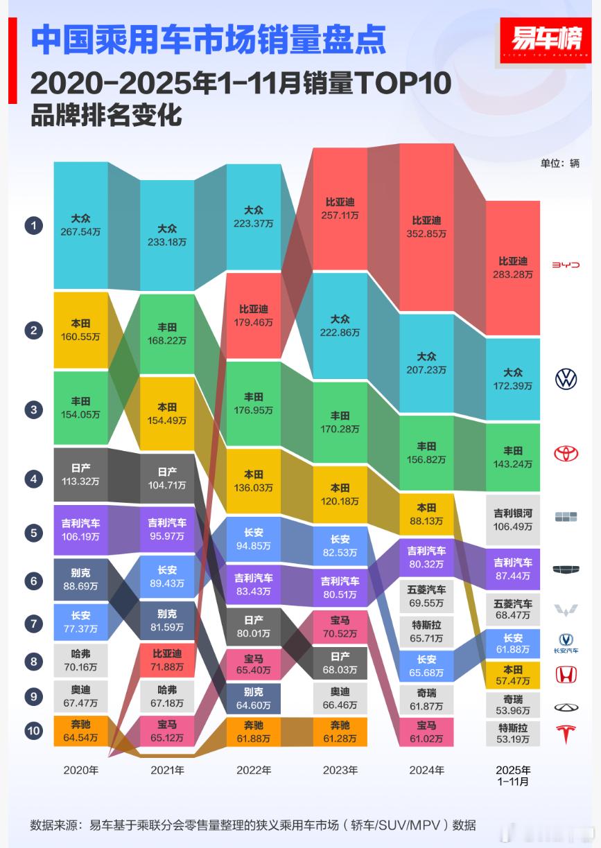 从 2020-2025 年 1-11 月中国乘用车销量 TOP10 榜单。短短五年,经历了两个时代。第一个时代:“燃油车主导” 到 “特斯拉领跑” 。2020 年 TOP10 几乎被轩逸、朗逸等合资燃油车包揽,仅哈弗 H6 一款自主 SUV 突围;但到 2025 年 1-11 月,Model Y、海鸥、宏光 MINIEV 等新能源车型占据 4 席,其中 Model Y 以 48.03 万辆登顶,成为首个拿下年度销冠的纯电车型。宏光 MINIEV 则凭借 “代步刚需”,连续 4 年跻身前三。而传统燃油车中,轩逸、朗逸虽仍在榜,但销量从 50 万级下滑至 30 万级以下,合资品牌的市场份额被持续挤压。比亚迪秦 PLUS、宋 PLUS 从 2022 年首次入榜,比亚迪在2023年强势崛起,到 2025 年都稳定在 TOP1 ;第二个时代:新能源国产车型开始霸榜。2025年开始,星愿第一,宏光第二,特斯拉第三。新势力里面,小米 SU7 以 24.70 万辆首次入榜。整体来看,这五年是中国乘用车市场的弯道超车成功,自主车企凭借电动化转型实现弯道超车,合资燃油车的优势快速消解,新能源车型已成为市场绝对主力。这次弯道超车,的确是一盘国家主导的大棋,前期还有诸多争论,到现在应该没人质疑了。大v聊车