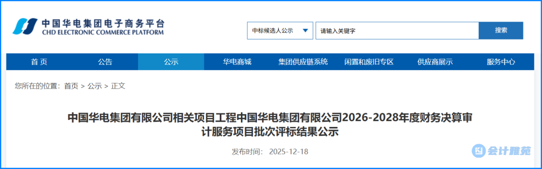 (4)审计-中国华电2026-2028年度财务决算审计服务项目标段Ⅳ(CHDTDZ007/18-QT-2705):华电国际(上市公司)产权单位,详见招标文件。
