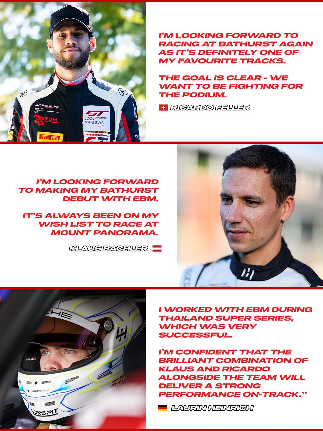自2019 年首秀即夺冠的壮举之后,Earl Bamber Motorsport(EBM)将时隔 6 年首度重返 巴瑟斯特 12 小时耐力赛。本次比赛,EBM 将派出由 Klaus Bachler / Laurin Heinrich / Ricardo Feller 组成的明星阵容,征战 Pro 组别。其中,Klaus Bachler 将迎来个人的巴瑟斯特首秀;Laurin Heinrich 在今年年初出战 Pro-Am 组别之后再次挑战全景山赛道;而 Ricardo Feller 则是车组中对巴瑟斯特最为熟悉的一位,自 2022 年 起每年都参与这项经典赛事。