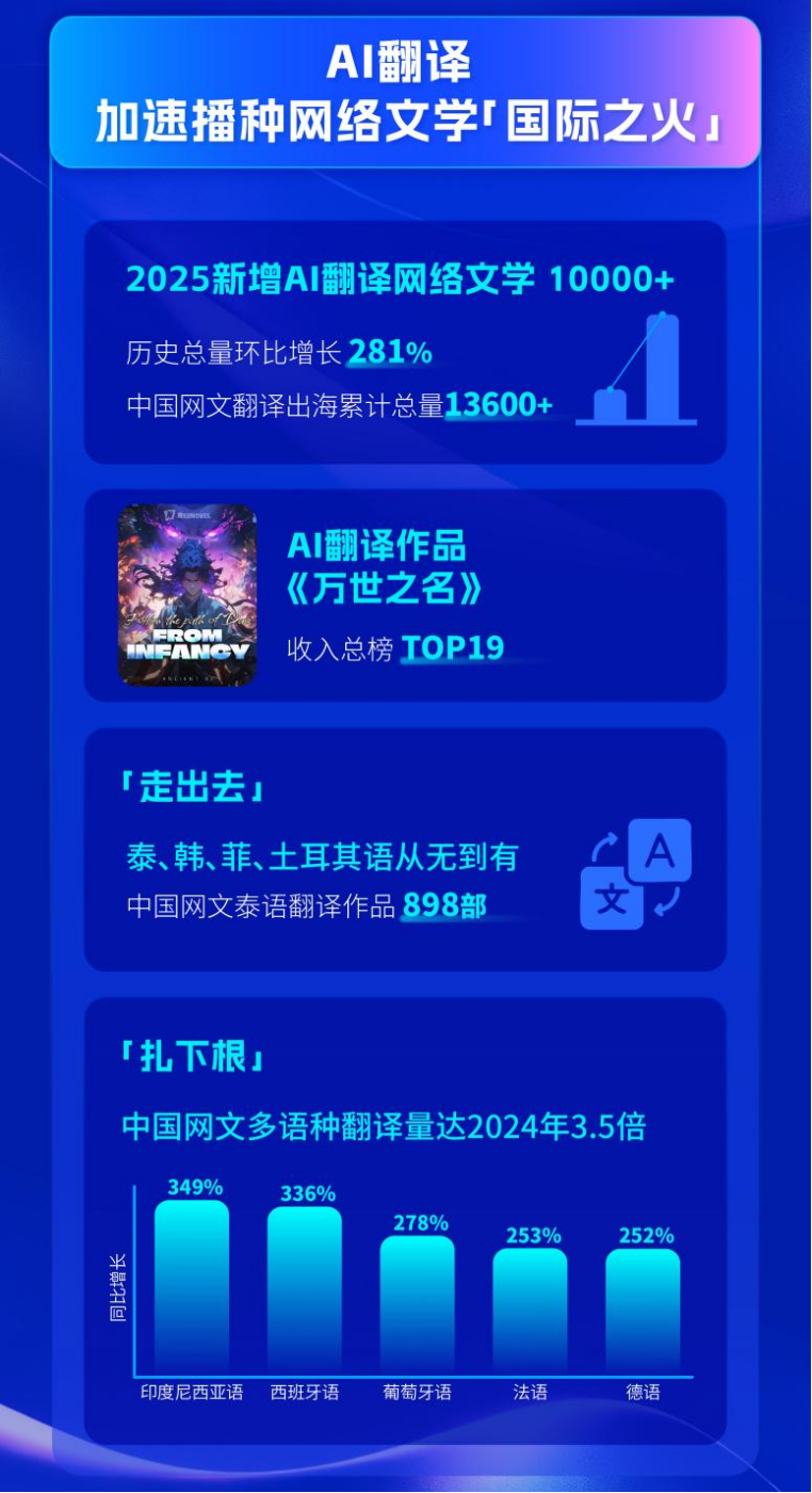 《报告》显示,2025年,AI翻译进一步实现了规模化应用,WebNovel全年新增AI翻译作品超10000部,历史总规模环比增长达281%。其质量也受到读者广泛认可,中国网文《万世之名》进入平台收入总榜TOP19。