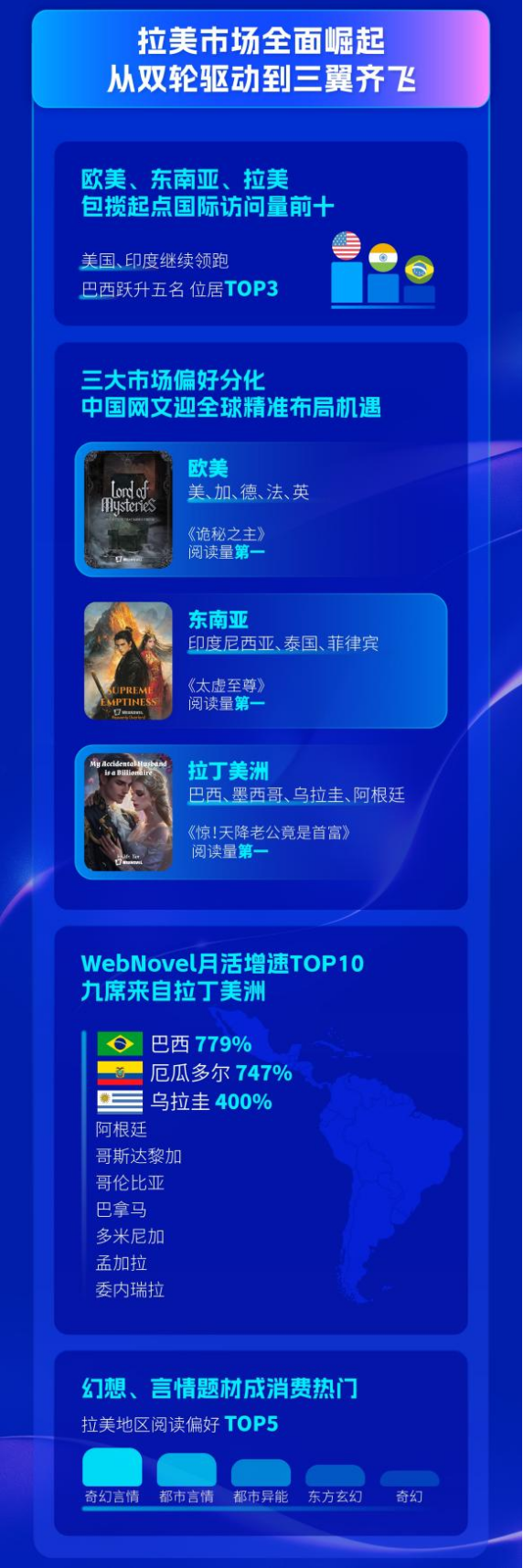 市场的多元化,带来了中国网文产业全球精准布局的机遇。欧美方面,《诡秘之主》位居阅读榜首,东南亚市场则由《太虚至尊》拔得头筹。在拉美,最受欢迎的五大题材依次为奇幻言情、都市言情、都市异能、东方玄幻、奇幻等。