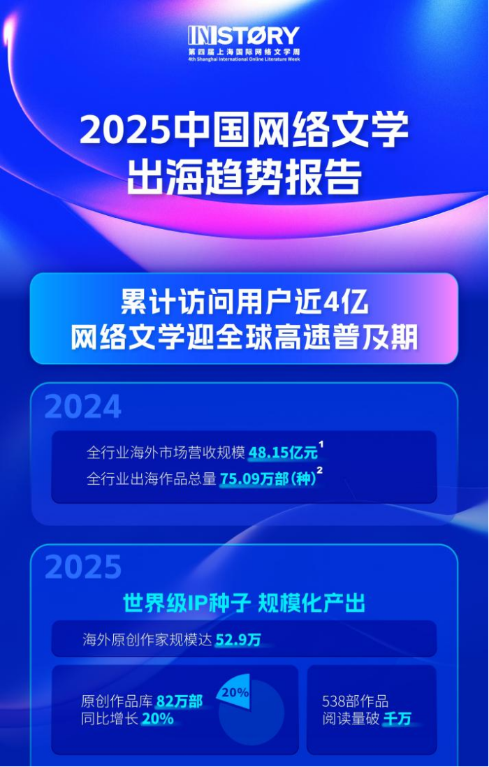 在内容生态方面,截至2024年底,中国网络文学作品累计规模已达约4210万部,创作基础持续夯实。海外原创生态同样蓬勃,截至2025年10月31日,WebNovel(起点国际)全球累计访问用户已近4亿,培育孵化了来自全球的近53万名作家、超82万部原创作品,作品总量同比增长20%,其中阅读量突破千万级的爆款已达538部。