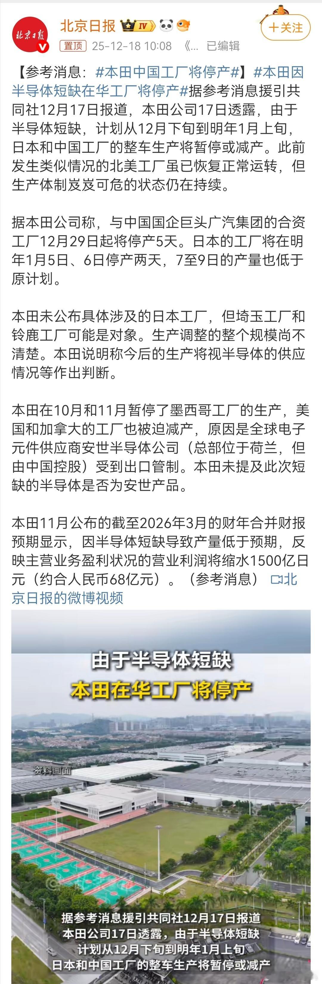 据investinglive报道,本田计划在未来几周内暂停日本和中国部分工厂的整车生产。将于1月5日至6日暂停日本国内工厂的生产;同时,其在中国的广汽本田三家合资工厂将从12月29日至1月2日全面停产。缺芯片缺的这么严重吗本田中国工厂将停产