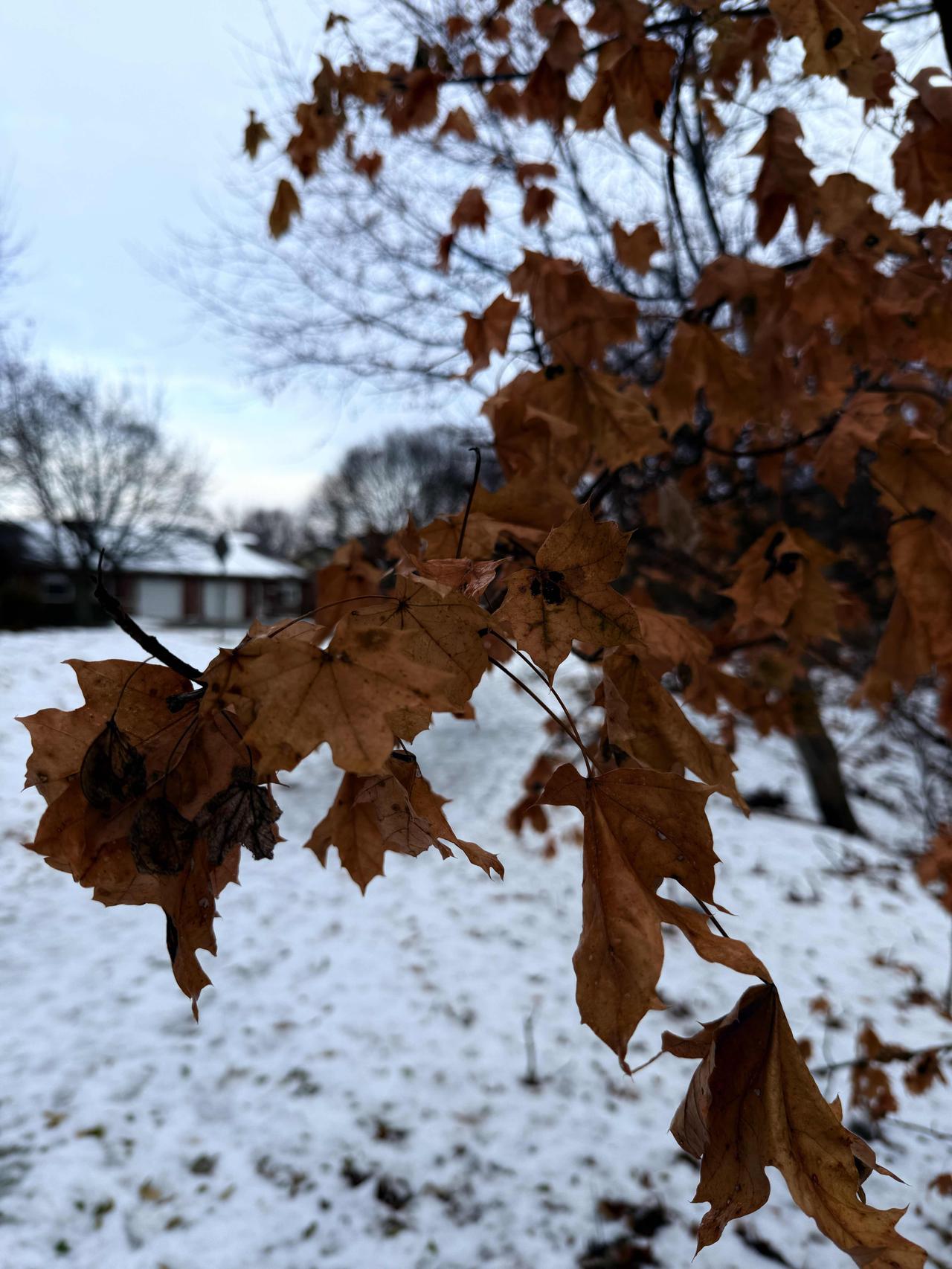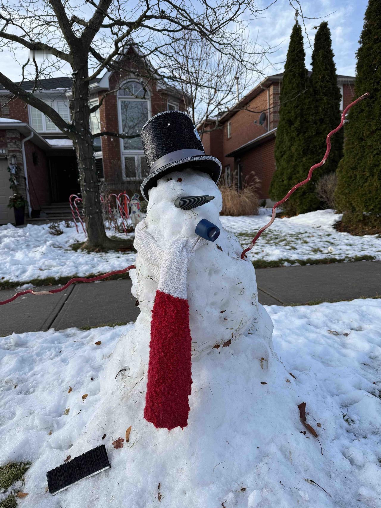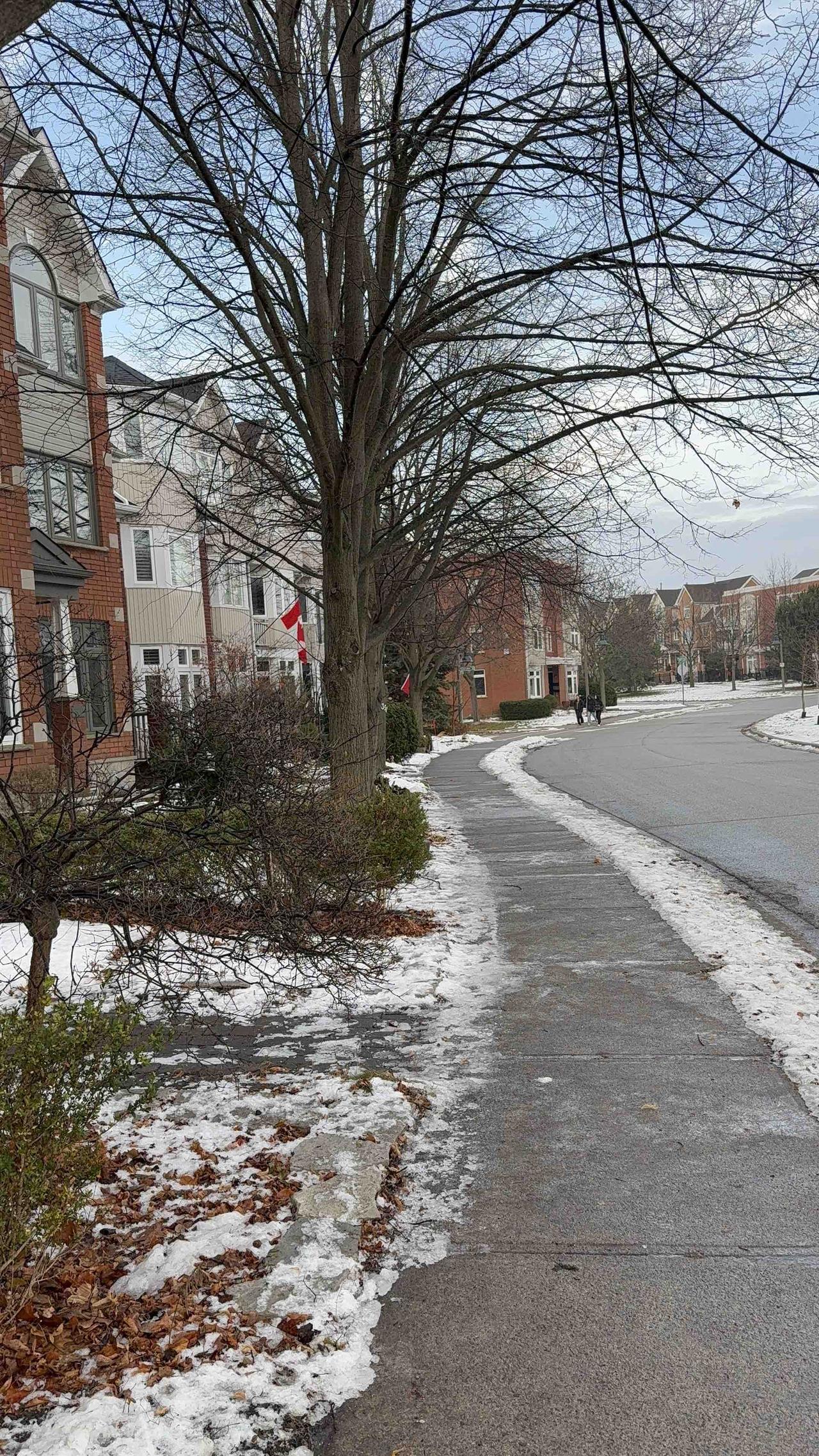 今天最高气温8度,昨天就5度了,未来一周基本都在零上!我是12月5号从北京来到的多伦多,今天好像是温度最高的一天! 这段时间下了好几场雪了,看着窗外的飘雪,还挺好的;但每次都不大,铲雪还只有一次,温度反反复复,也留不住很厚的雪! 多伦多的气候其实挺温和的,该下雨下雨,该大晴大晴,该冷也冷,但受的住。大风极少!夏天虽然很多人也说热,但开空调的日子也没几天,尤其晚上,还是挺凉快的! 就是冬天有点长,要来年五一才开始真正暖和起来! 冬天的小树林里没什么人行走,路上还是有冰,时不时有松鼠跳来跳去,吧嗒着地上的落叶,哗哗作响;有一只松鼠尾巴还有白色鬃毛,刚开始以为是臭鼬,仔细一看不是;树叶大体已落尽,但还有些残留,甚至还有枯红叶。间或有几颗高大的松树,依然很绿!柳树垂着细细的枝条,感觉也像是绿的! 走到小区的街角,那两家常年挂着国旗的人户,红底白枫叶旗还在飘动,有几个年轻的学生在门口小路上走着、说着!有人做了一个木质的圣诞树,立在门口,想必不是买的,应该是自己在家做的,蛮有创意!再走几步,雪人头上还戴着圣诞老人的帽子!但五官已看不出来,因为雪在化! 圣诞节快要来了!
