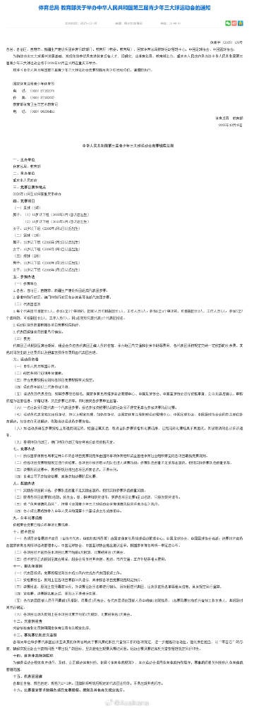 体育总局、教育部发布第三届三大球运动会竞赛规程总则,第三届三大球运动会将于2026年11-12月举行,由重庆市承办。足球赛事分男子U18、男子U16、女子U18三个组别。
