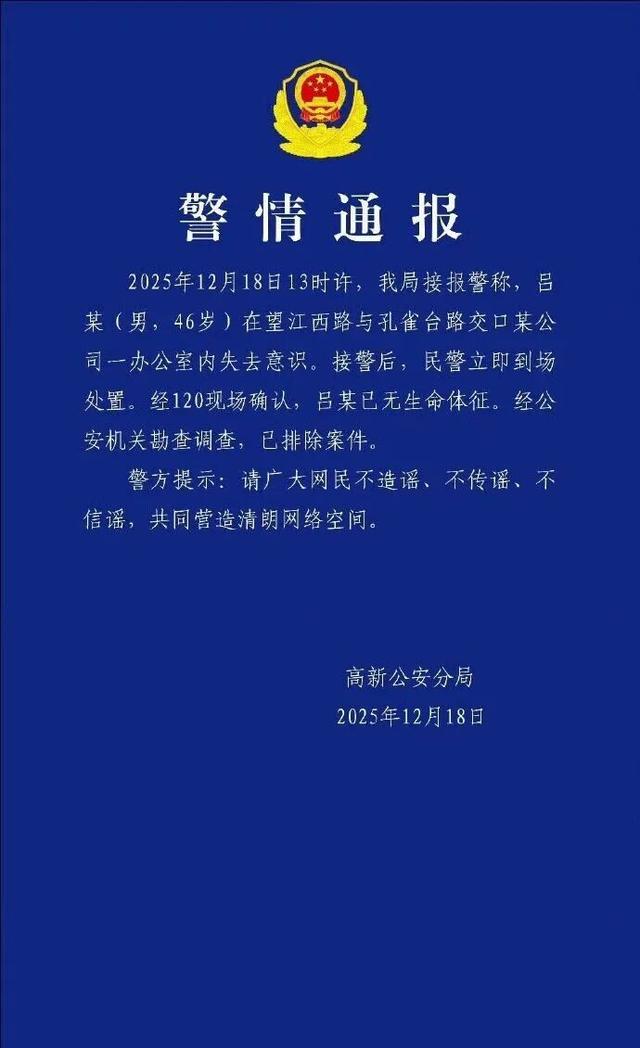 18日,合肥警方通报:2025年12月18日13时许,我局接报警称,吕某(男,46岁)在望江西路与孔雀台路交口某公司一办公室内失去意识。接警后,民警立即到场处置。经120现场确认,吕某已无生命体征。经公安机关勘查调查,已排除案件。