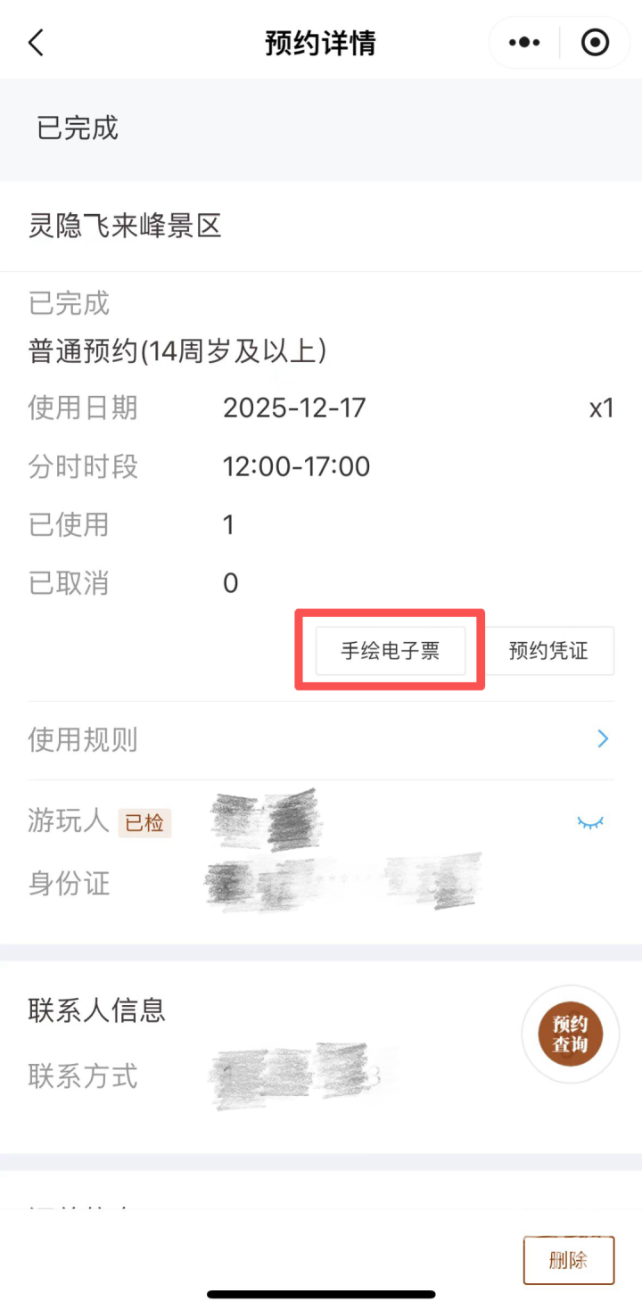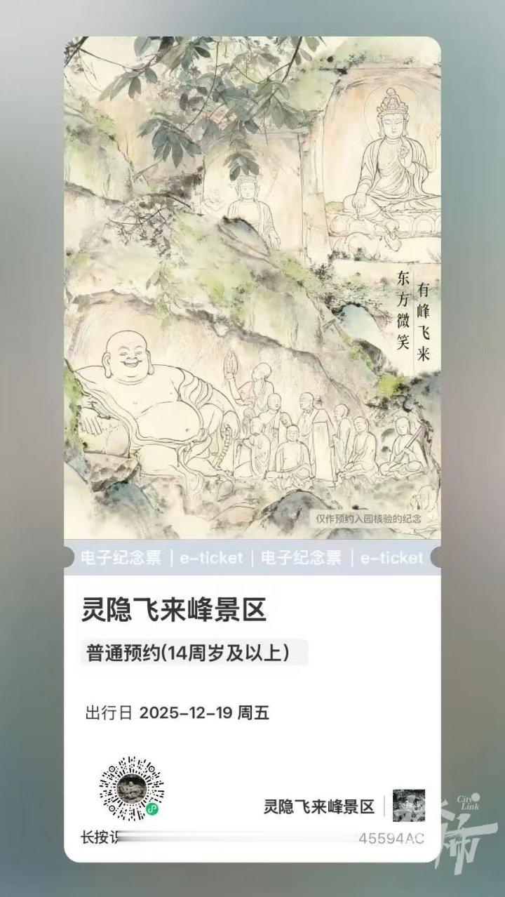12月19日,杭州灵隐飞来峰景区预约系统内新增了一个“彩蛋功能”——即日起,新生成的预约订单,在成功核验入园后,将在预约订单页面自动获得一枚专属的“电子纪念票”。