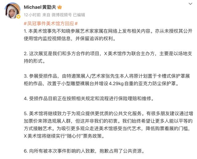 12月19日,X美术馆创始人@Michael黄勖夫回应张凯毅黄金凤冠事件: