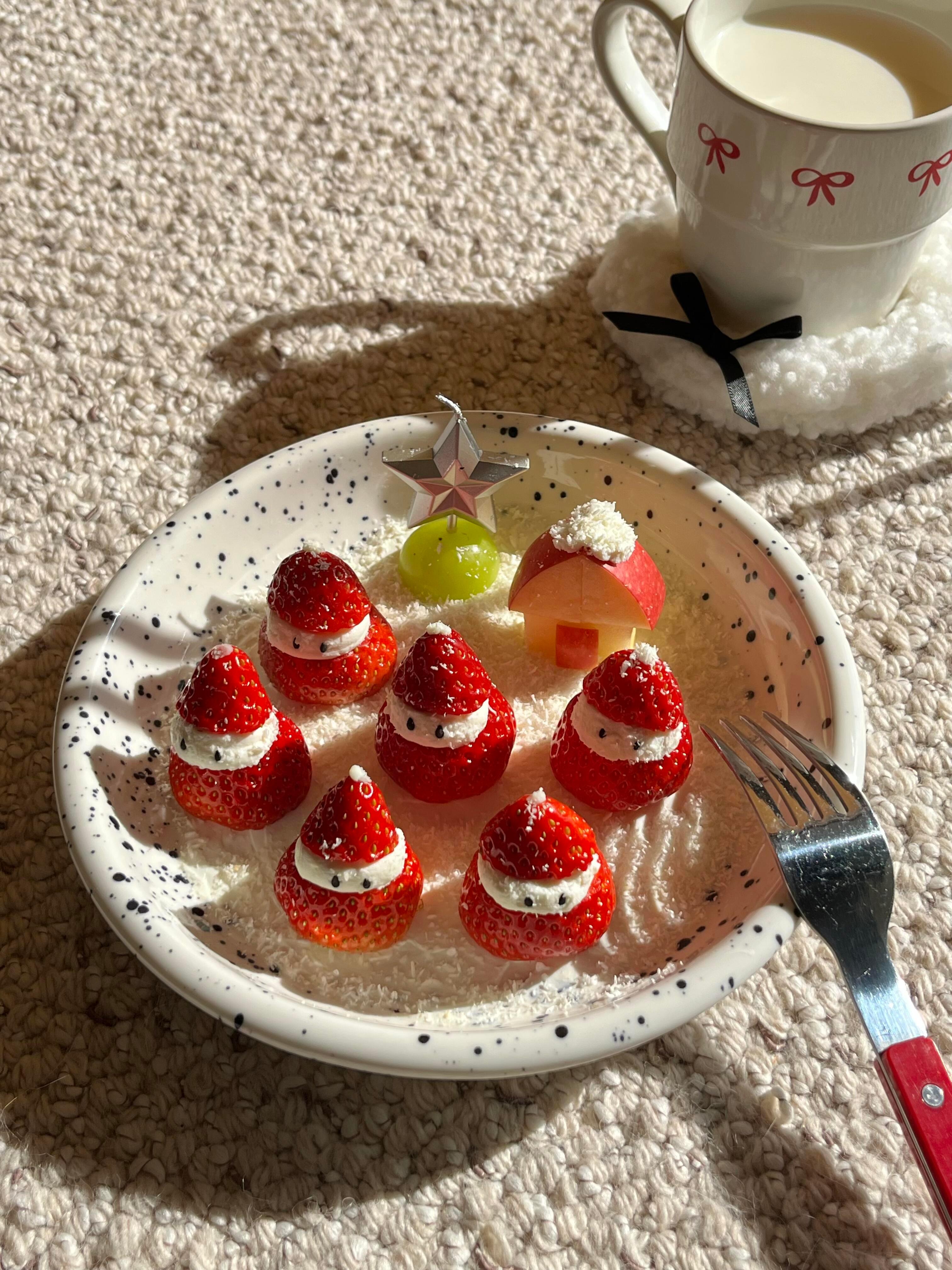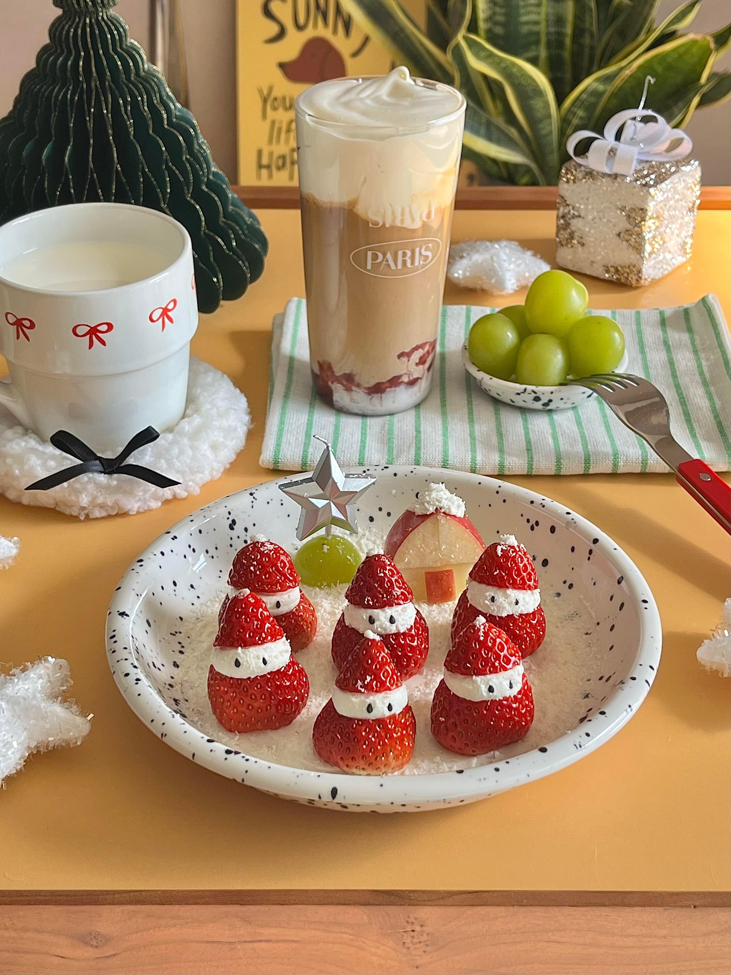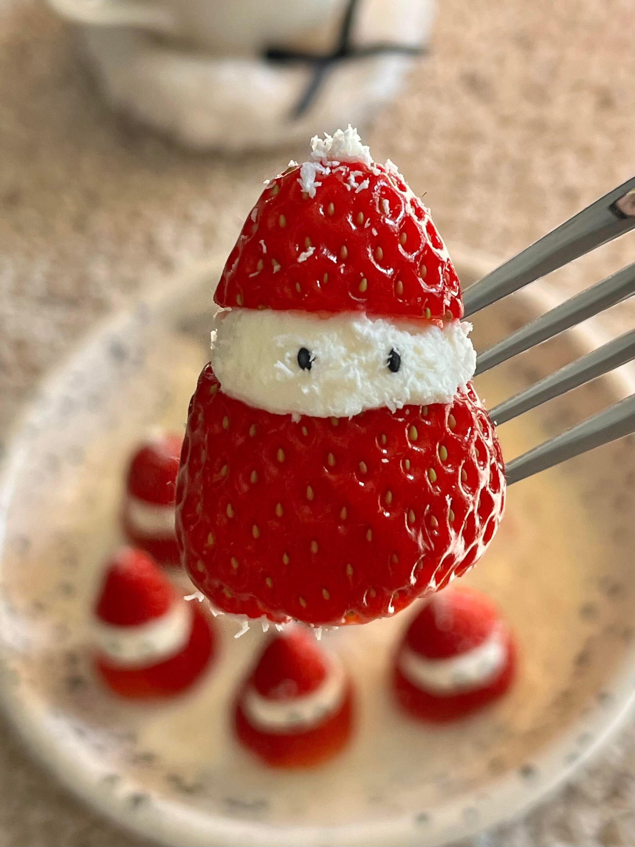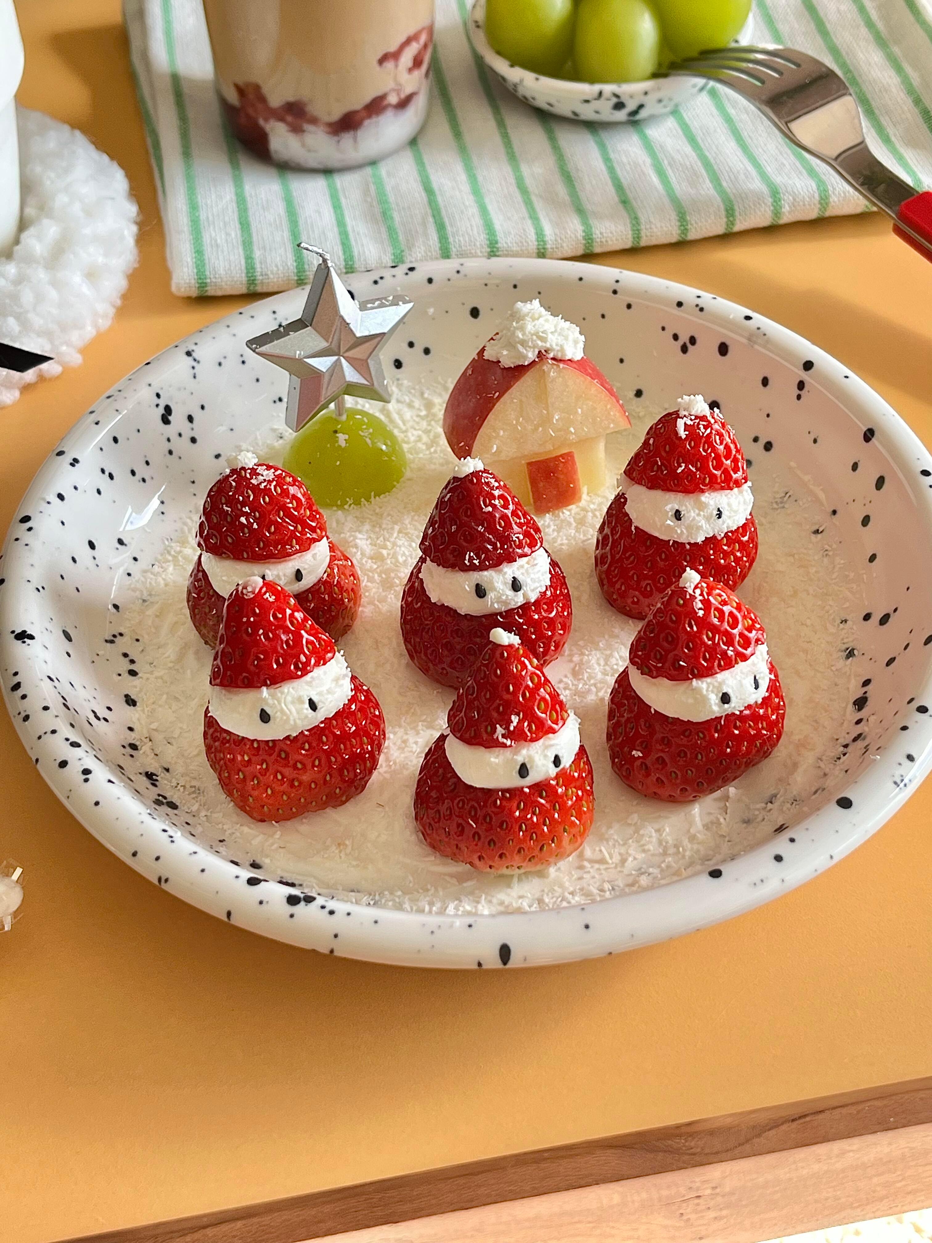 凑热闹做个草莓雪人~当下午茶真不错🧑🎄⛄️雪人脑袋是过滤一夜的希腊酸奶用裱花袋挤 很好操作!一共3步完成:1.酸奶在盘子抹一层地基2.草莓切段挤上酸奶3.切一只苹果房子🍓爱吃草莓的姐妹快试试吧~我的年度美味清单