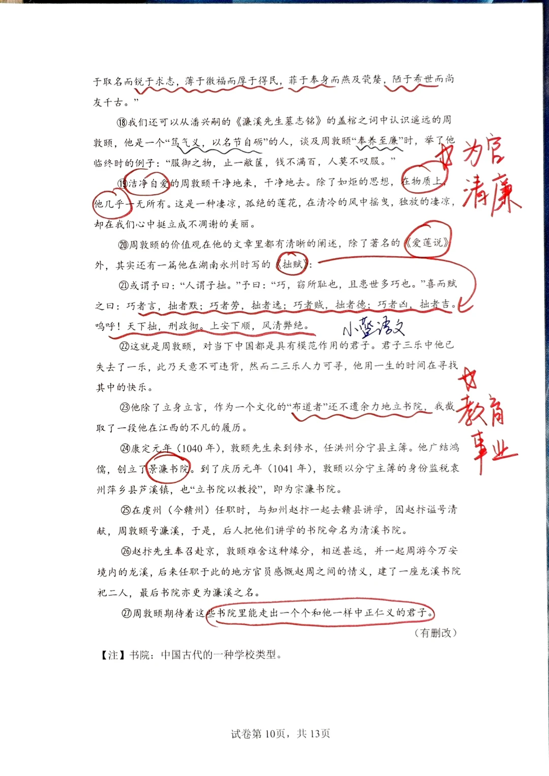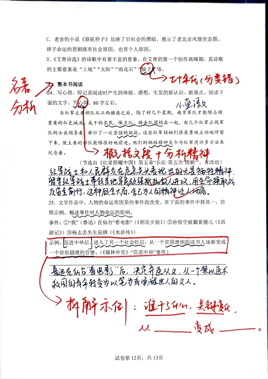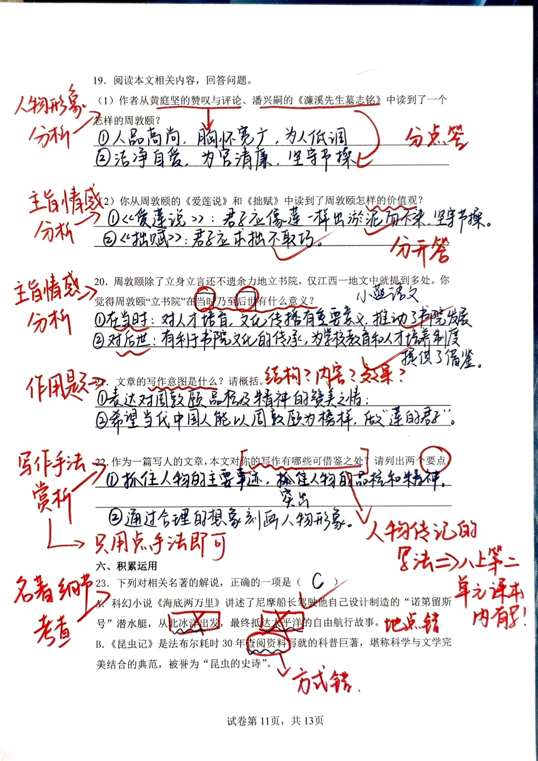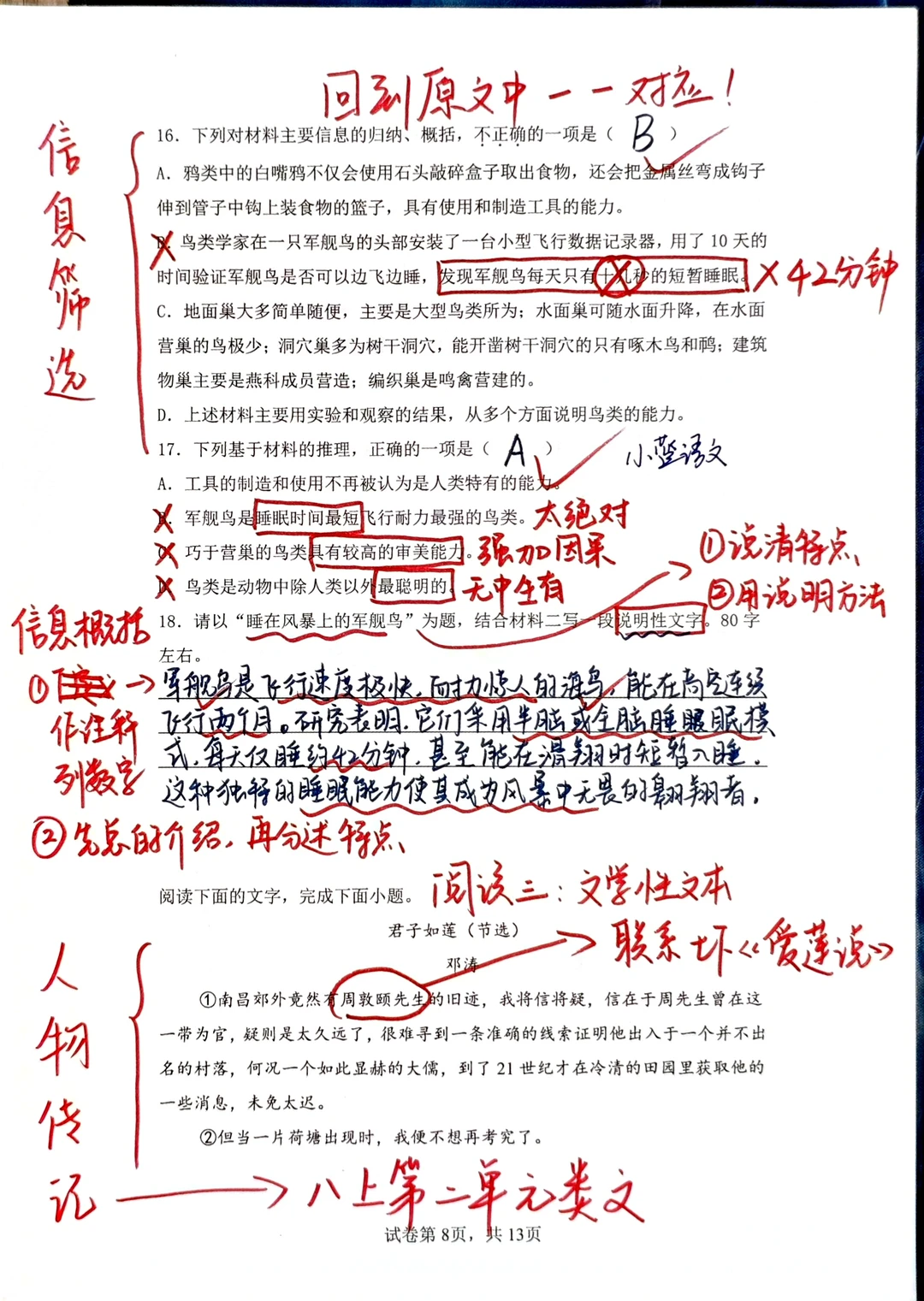 [星R]三、文学性文本阅读的问题提醒我们一定要对课内课本非常熟悉,课本内的每一篇文章,每一个知识点都要知道是在什么位置,都要知道在讲什么:例如《爱莲说》的主旨,就要迁移到阅读理解的问答题中回答;再例如最后一题“写法借鉴”,实际上就是在问“人物传记的写法”,八上第二单元的语文课本内有一模一样的内容。