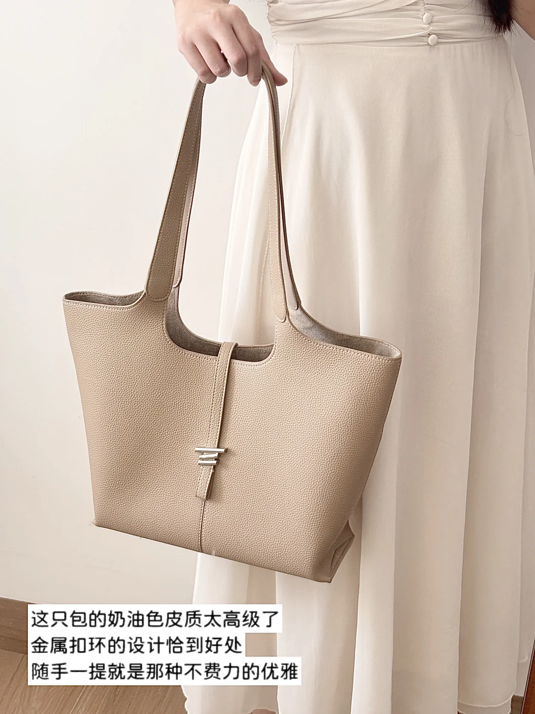 米色荔枝纹皮质自带温柔感,搭配极简的轮廓