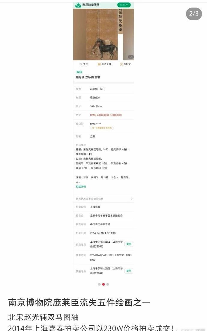 南京博物院流失的那5件文物画,经查有一幅已经于11年前被拍卖掉了,卖了230万元。 这幅画就是北宋赵光辅的《双马图轴》,已经确认是遗失的那5幅画作之一。于2014年在上海嘉泰拍卖公司以230万元成交。 要知道,这5幅画其中的仇英的《江南春》,曾经在2001年文物商店以6800元售出,出售的发票标注购买者为"顾客",违反当时需登记真实姓名的规定。 现在《江南春》被标价8800万拍卖,而《双马图轴》估计当初也是被某“顾客”已几千元当做赝品买走,这“顾客”到底是谁,谁会在20多年前花几千块买一副赝品。 6800块的古画,20多年转眼变8800万,一万多倍的收益,这是什么样的暴利啊,南京博物院当年运作这事的领导们说不定都不在人世了,现在能查的就是拍卖的出售方,理论上不难查,可实际上或许会很难。