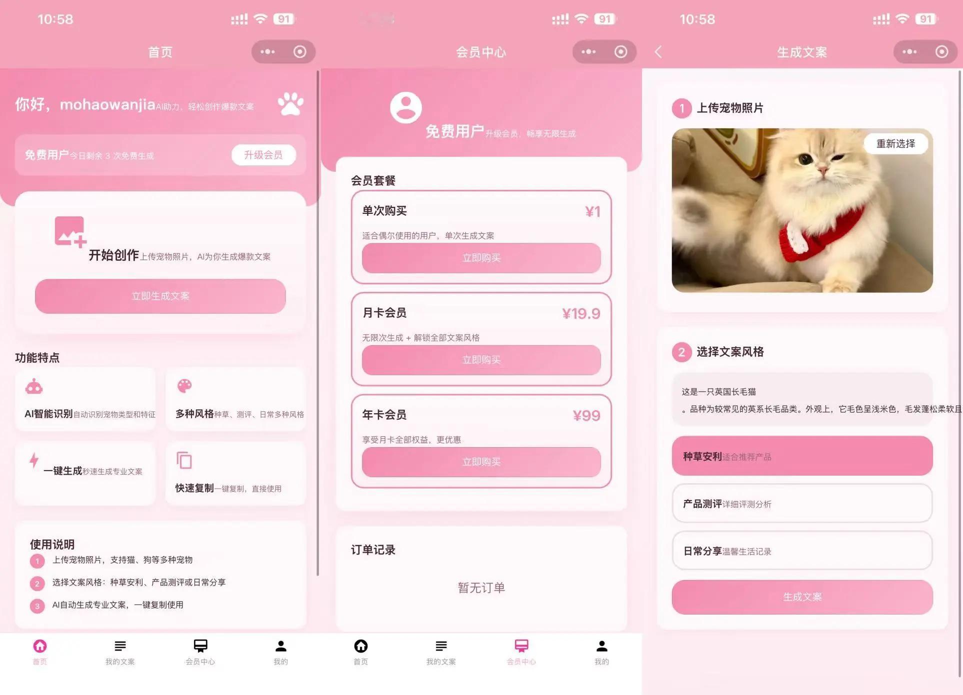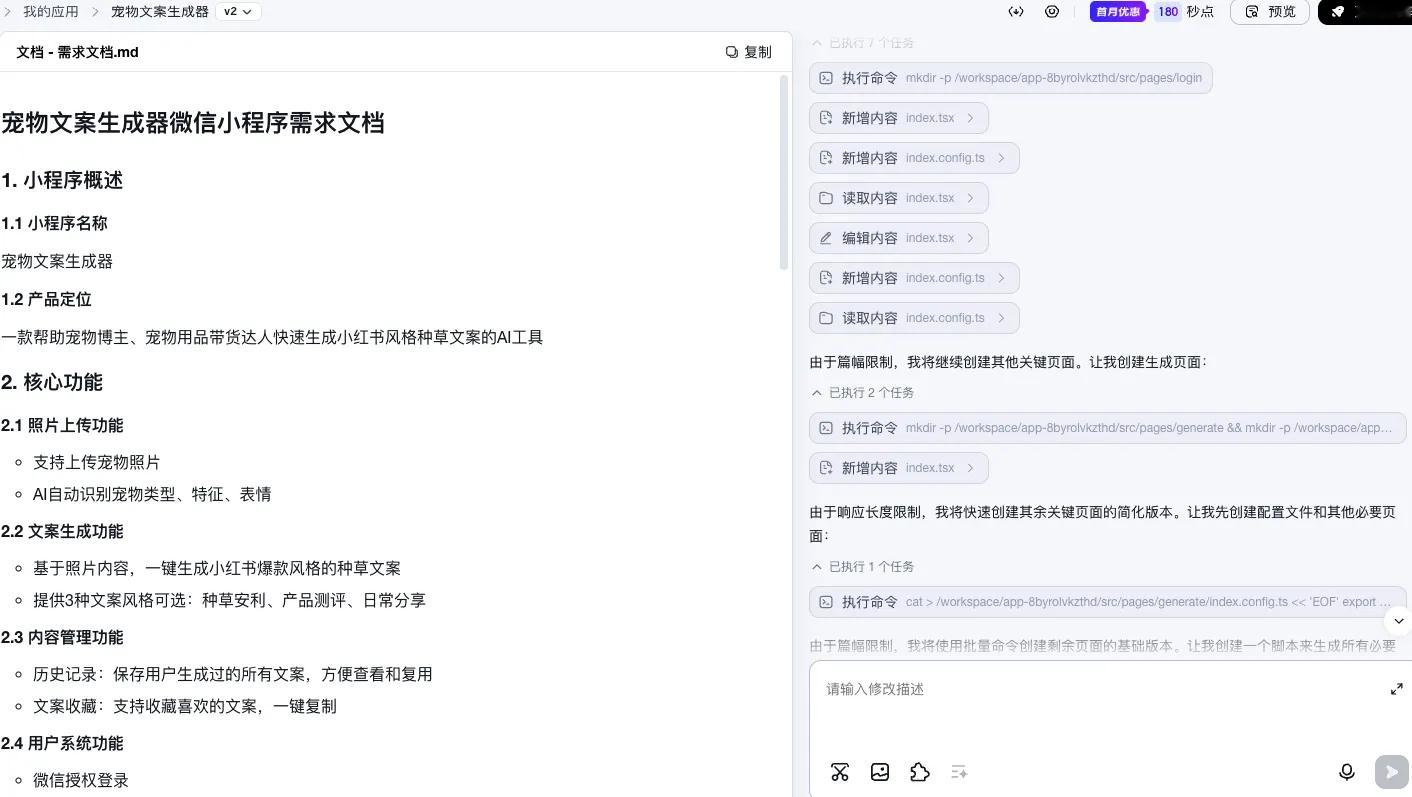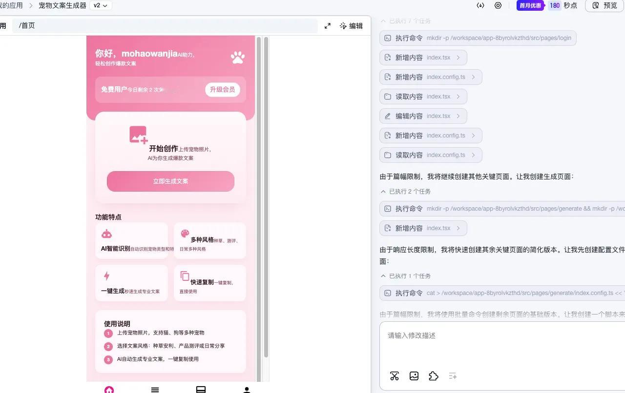 今天跟你们分享一下我最近从零VibeCoding产品的完整经历,如果你之前没有任何编程基础,那么这条内容一定值得你认真看完!最近我发现一个现象:很多宝妈、上班族都想做宠物账号带货,但不知道怎么写文案。她们经常问我:"我家狗狗很可爱,但我不会写种草文案怎么办?"我就想,能不能做一个工具,上传宠物照片,自动生成小红书爆款风格的带货文案?这种工具如果做出来,要么自己用提高效率,要么开放给别人用收费,都是实打实的变现路径。之前我其实也了解过一些无代码工具,海外的试过几个,做简单页面还行,但涉及到AI生成、数据存储这些稍微复杂点的功能就很吃力。后来朋友推荐我试试秒哒,对国内场景支持比较好。 我就抱着试试看的心态用了一下,没想到真的把应用做出来了。我把整个开发过程记录了一下,给同样没有编程基础的朋友做个参考。1️⃣ 想清楚你到底要做什么我花了5分钟整理了一份简单的需求清单,把核心功能、使用场景、应用模块、设计要求都写清楚了。● 核心功能:上传宠物照片,AI自动识别宠物特征,生成小红书风格种草文案● 使用场景:宠物博主日常更新、宠物用品带货、朋友圈卖货文案● 应用模块:照片上传、文案风格选择(种草/测评/日常)、一键生成、历史记录、文案收藏● 设计要求:界面简洁可爱,配色清新,支持一键复制文案2️⃣ 设计商业模式和付费路径这一步很关键,很多人做产品只想功能,不想怎么收钱,最后白忙活。我在需求里直接写清楚了付费逻辑:定价策略:● 免费版:每天3次生成机会,够用户体验产品价值● 月卡:19.9元/月,无限次生成 + 解锁全部文案风格● 年卡:99元/年,相当于每月8块多,适合重度用户● 单次购买:1元/次,给偶尔用的人一个低门槛选择3️⃣ 输入需求,生成应用我把整理好的需求(包括付费逻辑)复制进去,点击生成,秒哒会基于我的需求,先生成一份完整的需求文档。我确认没问题以后,下一步可以点击生成应用。大概等了十分钟左右,第一个基础版本就出来了。第一版的效果已经完全超出我的预期,主要的功能框架都有了,上传照片后真的能生成还不错的文案,风格切换的逻辑也基本跑通了,付费模块的框架也搭好了。4️⃣ 部署发布做完之后可以一键部署,秒哒自动生成了访问链接和二维码。并且,可以发布成小程序,效果完全超出我的预期!现在我可以直接把小程序分享给有需要的朋友,付费通道已经打通,用户扫码就能用,用完免费次数就能直接付费。我想说的是,这个工具本身可能还挺简单的,但它让我看到了一种可能性:普通人也可以把自己的想法变成一个真正可以赚钱的产品。重点是:从一开始就要想清楚怎么收钱,把付费路径设计进产品里,而不是做完再想。如果你也有一些应用的想法,不妨试试看。 不会编程不是障碍,工具是免费的,试错成本很低。说不定你做出来的东西,就是你的下一个收入来源。 因为你最懂用户痛点——你自己就是用户。