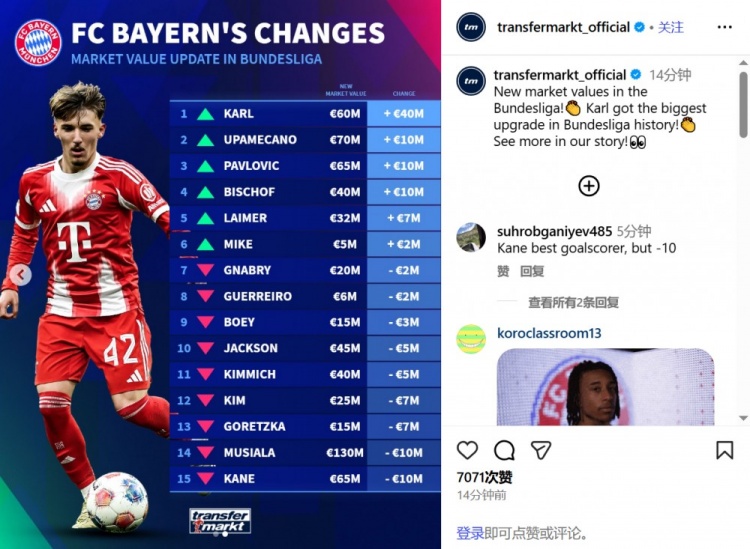 直播吧12月19日讯德转公布了拜仁球员的身价变化,其中,小将伦纳特·卡尔的身价上涨了4000万欧元,来到6000万欧元,凯恩和穆西亚拉的身价都下降了1000万欧元。