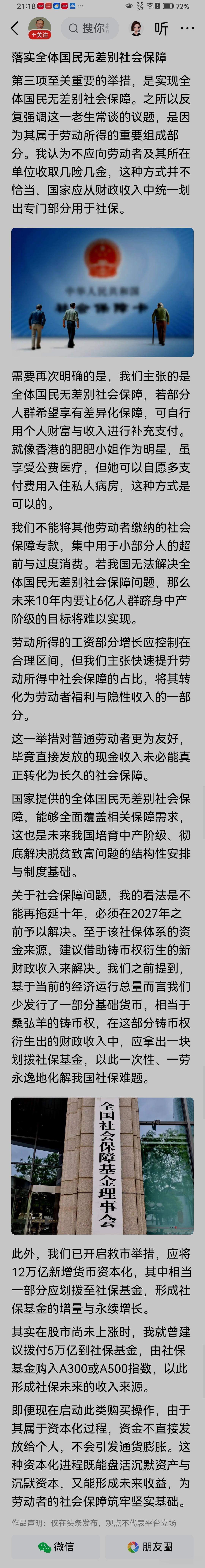 12月19日,卢麒元发表一篇文章:6亿人进中产阶级?先过 “全体无差别社保” 这道门槛。文章中,卢麒元认为:不应向劳动者及其所在单位收取几险几金,这种方式并不恰当,国家应从财政收入中统一划出专门部分用于社保。 卢麒元的这一提法,明显的与目前执行的“多缴多得”社保政策完全是相反的。对此,有支持卢麒元的,也有反对他的。 支持卢麒元不缴社保就能领养老金的网友认为:社保是用来保障退休后生活的,不是用来补偿贡献的,个人贡献通过在职工资已经补偿过了。所以,从社会公平的角度说,貌似公平的多缴多得,其实是不公平的。 反对卢麒元不缴社保就能领养老金的网友认为:中国公民的认知、素质、文化等差距非常大,导致对社会的贡献差距也大,如果社会保障的一视同仁,对那些贡献大的人不公平。所以,目前还是应优先保障部分人的待遇,让有能力创造财富引领中国走向辉煌的群体先富裕,最终再实现无差别化社会保障。 以上两种观点说的似乎都有道理,但是,我非常支持卢麒元“全体无差别社保” 观点。尊敬的网友,您是否支持呢?