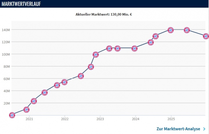 这是穆西亚拉自2020年出道以来身价首次下跌,德转管理员给出的下调理由是:穆西亚拉仍在从重伤中恢复,目前还无法准确预见他何时能重返赛场。