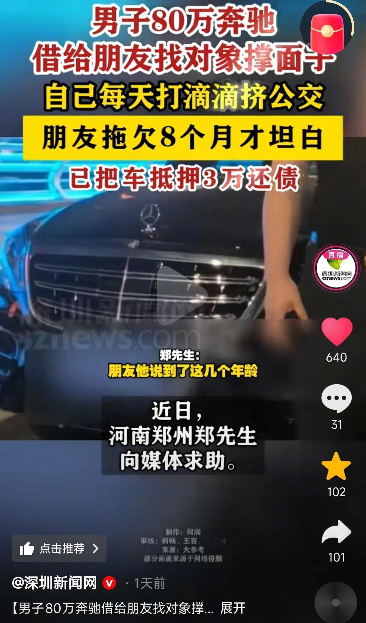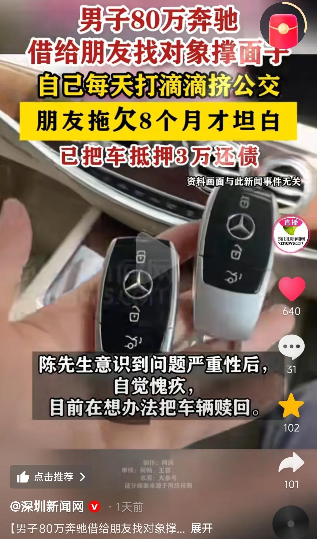 “我当你是兄弟,你把我当提款机!”80万奔驰借朋友,竟被3万块偷偷卖掉!车主崩溃:每月车贷6千,赎车要价8万5 “兄弟,这次相亲成败全靠你了!借你奔驰撑个场面,吃完饭就还!” 看着三十好几还在为找对象发愁的兄弟,郑州的郑先生咬了咬牙,把车钥匙递了过去。他这辆奔驰S320,买来花了整整80万。 他做梦都没想到,这一借,差点把车借“没”了。 接下来的八个月,郑先生过上了打车通勤的日子。头两个月,朋友还说相亲顺利;到了第三个月,变成“车有点异响,我帮你修修”;第六个月,电话那头永远是“哥,我正忙呢”。直到第八个月,在郑先生几乎要报警时,朋友才吞吞吐吐说了实话: “车…让我抵押了。当时急用钱,就押了3万。” 80万的车,3万就抵押了?!郑先生气得手直抖。但更离谱的还在后头——当他决定自己掏钱赎车时,抵押方报出的价格让他眼前一黑:“十天利息三千,现在连本带利8万5。钱不到,车你别想见。” 原来,朋友当初就写了张潦草的欠条,对方微信转了3万就把车开走了。而郑先生自己,每个月还得还6000多的车贷。他等于在替两个“债主”打工:一个银行,一个来路不明的放贷人。 转机出现在他咨询律师之后。 律师告诉他三个关键点:第一,朋友未经同意抵押你的车,这抵押根本无效,你有权直接要回车;第二,“十天三千”的利息高得离谱,超过法律保护的部分不用给;第三,这八个月的损失,完全可以找那个“朋友”索赔。 事到如今,车也许能要回来,但情分彻底没了。那个朋友反复道歉,说自己当时“脑子一热”,可裂痕已经像挡风玻璃上的裂痕,再也修不好。郑先生苦笑着说:“以后谁找我借车,我就把这条新闻转给他看。” 这件事给我们所有人都上了一课:再好的关系,一旦牵扯到大额财产,该立的规矩就得立。借车时签个简单的协议、拍个照留个底,不是不相信朋友,而是对彼此关系的保护。毕竟,真正的朋友,不会让你在“情义”和“损失”之间做选择。 如果你的朋友借车,你会答应吗?遇到类似情况,你觉得该怎么办?