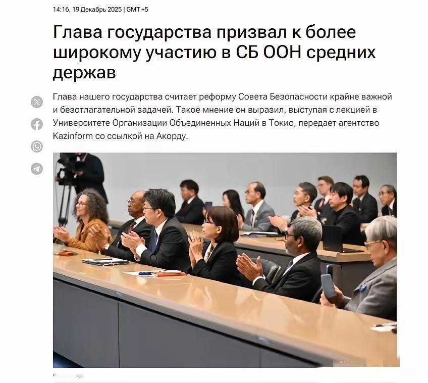 哈萨克斯坦或将支持日本“入常”?12月19日,托卡耶夫在东京联合国大学发表演讲,呼吁说:联合国安理会应该让更多的中等国家参与。这与日本“入常”的诉求相呼应,在现场获得了热烈的掌声。 这话听着像支持,实则全是算计。托卡耶夫刚和日本敲定5亿美元能源合作,转头就投桃报李,用模糊表态给日本递台阶,算盘打得比谁都精。 日本“入常”梦做了几十年,2004年拉着印度、德国、巴西组“四国联盟”,结果因为二战历史污点,被多国抵制,联盟直接散伙。 想改《联合国宪章》入常?门槛高到离谱。得经联合国三分之二会员国同意,还得五常全票批准,这么多年没一个国家能迈过去。 托卡耶夫可没明说支持日本,只提“中等国家”,既不得罪中俄,又能讨好日本拿实惠,这种模棱两可的话术,把投机玩到极致。 亚洲多国早亮明态度,韩国、朝鲜坚决反对,东南亚不少国家也对日本历史态度存疑,没多少人愿意给二战策源地投赞成票。 日本自己也没摆正位置,一边喊着“入常”要承担责任,一边年年增加军费,2025年国防预算突破7万亿日元,野心藏都藏不住。 托卡耶夫的表态更像一场外交表演,哈萨克斯坦本身影响力有限,就算真支持,也改变不了日本“入常”的渺茫前景。 五常的态度才是关键,俄罗斯早明确反对,中国也坚持要正视历史,没有这两国点头,日本再怎么拉拢也没用。 日本总想绕开历史谈“入常”,却忘了侵略历史是刻在亚洲人民心里的痛。不彻底反省,永远别想获得真正的国际信任。 这场看似呼应的外交互动,本质是各取所需的利益交换。日本换得虚假的支持声,托卡耶夫拿到真金白银,只有“入常”本身还是镜花水月。 历史不会纵容投机者,联合国安理会的席位,从来不是靠拉拢就能得到的。日本若真有诚意,先从正视历史、承担责任做起。 各位读者你们怎么看?欢迎在评论区讨论。