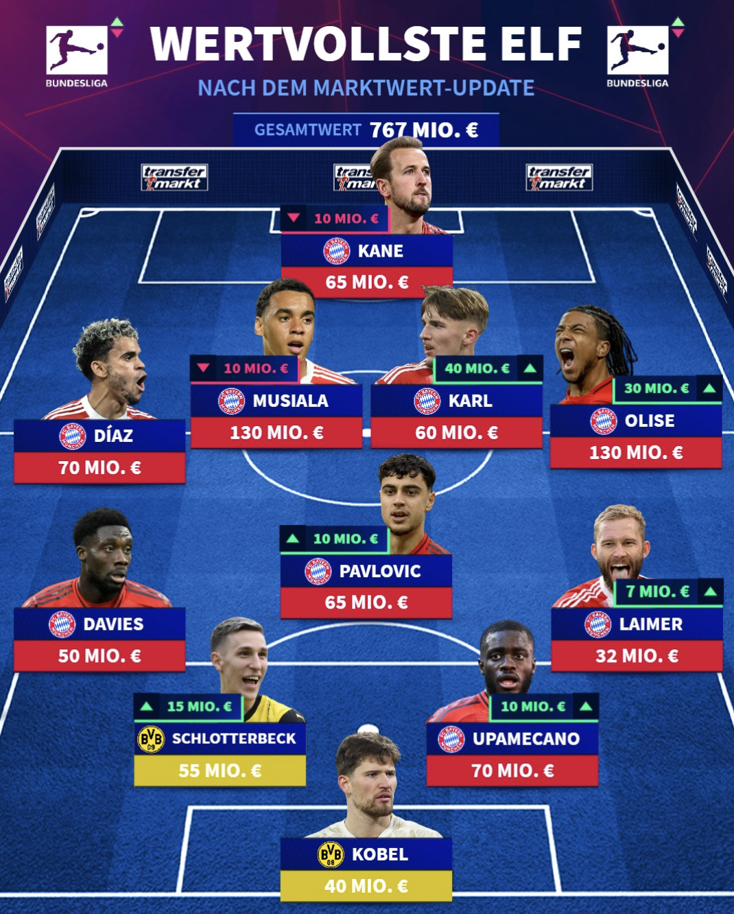 穆西亚拉和奥利塞以1.3亿领衔总价7.67亿的阵容,其中拜仁独占9席、多特占据剩余2席。
