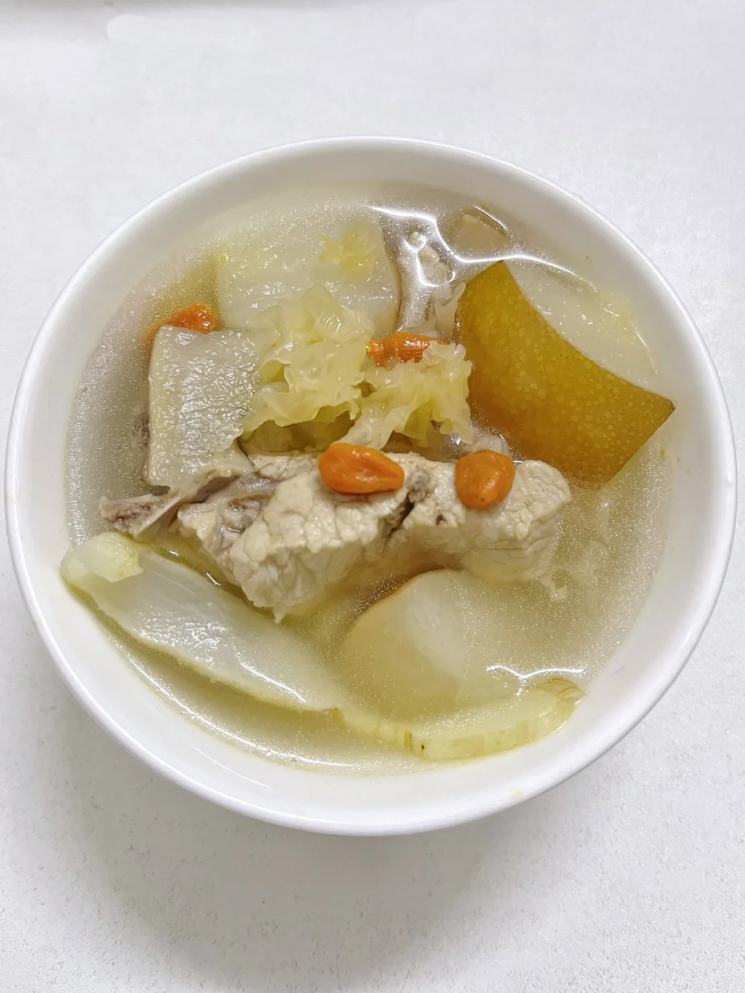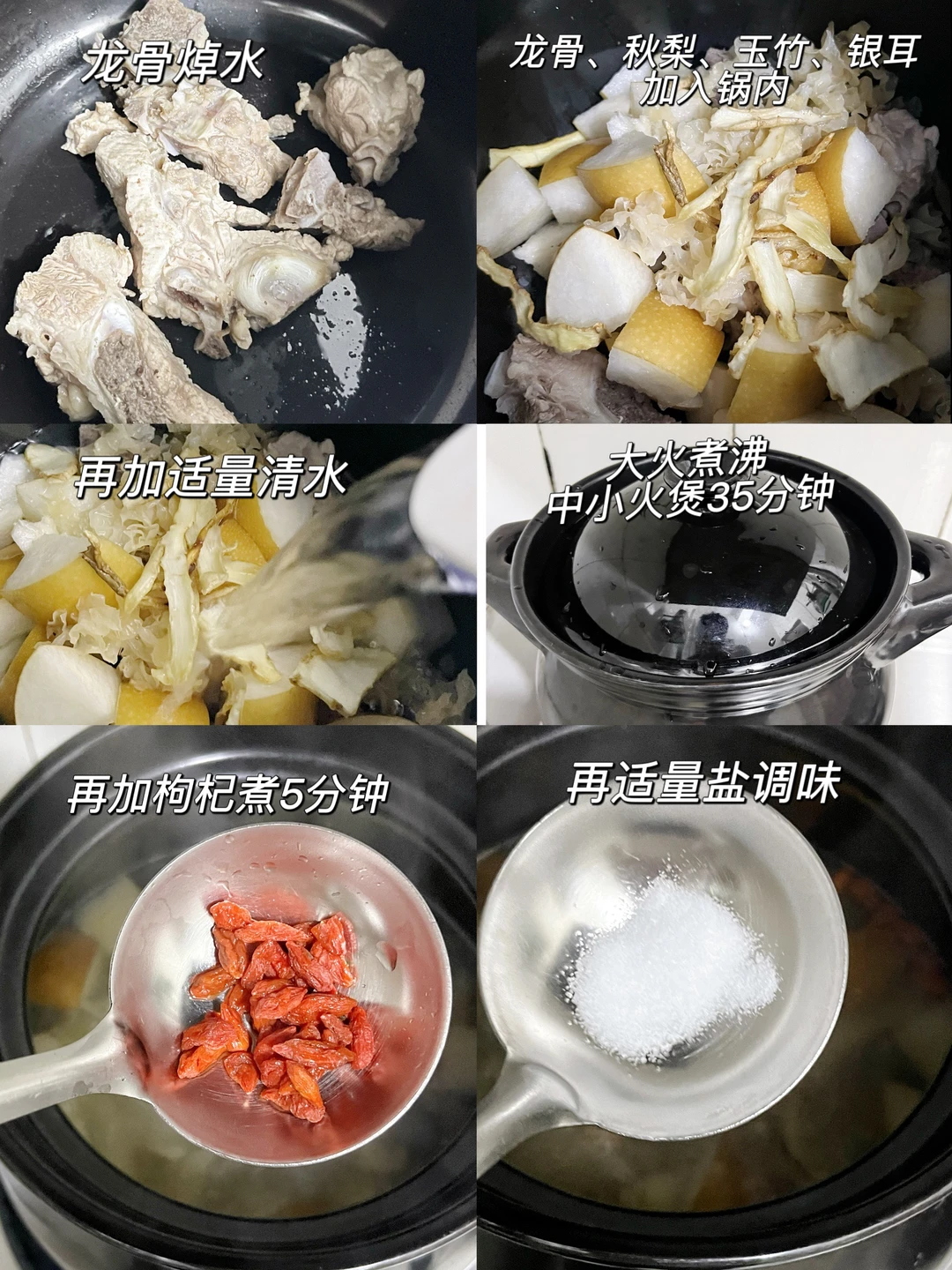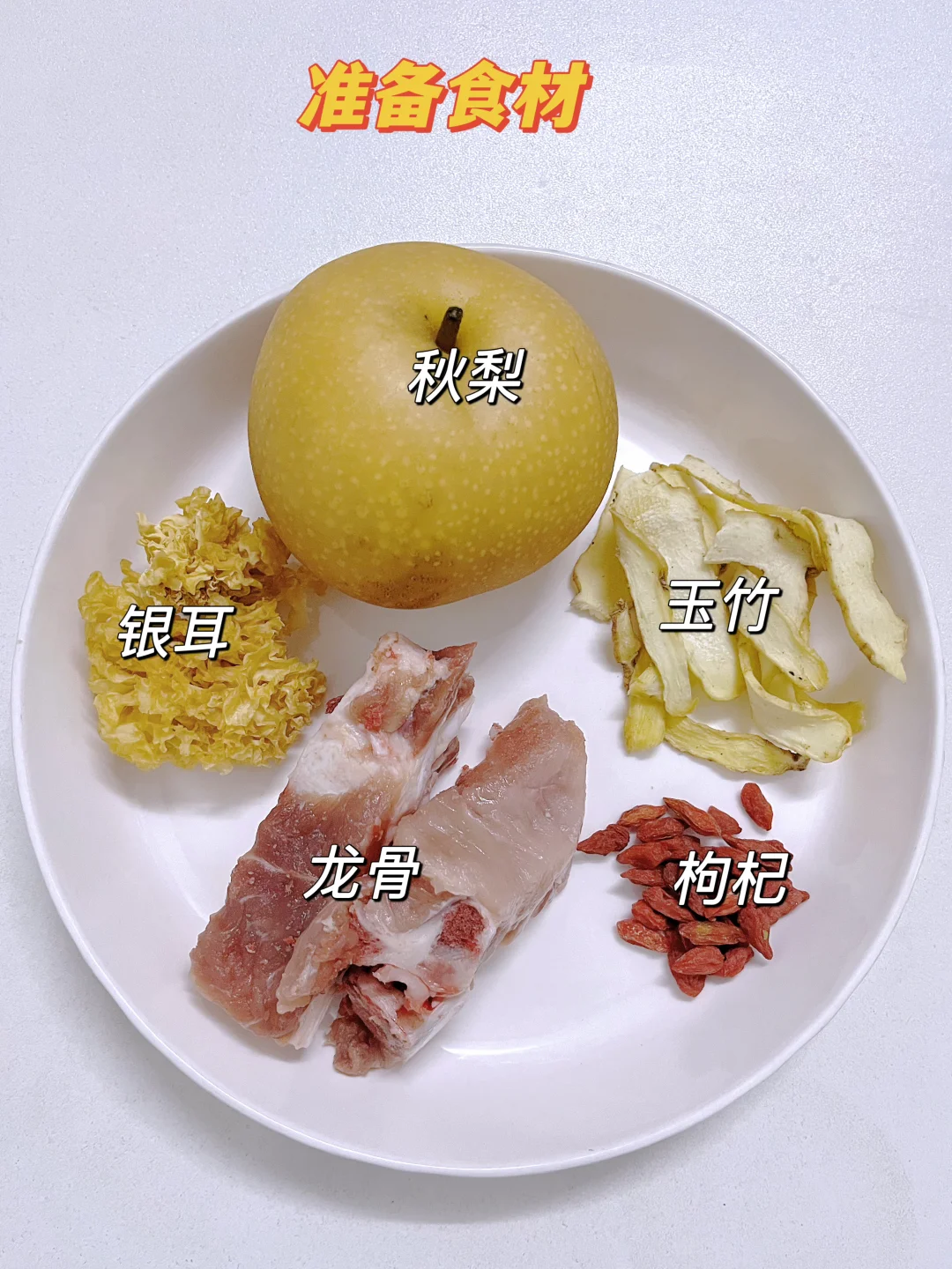 秋梨1个、银耳1朵、龙骨300g、玉竹15g、枸杞1小把
