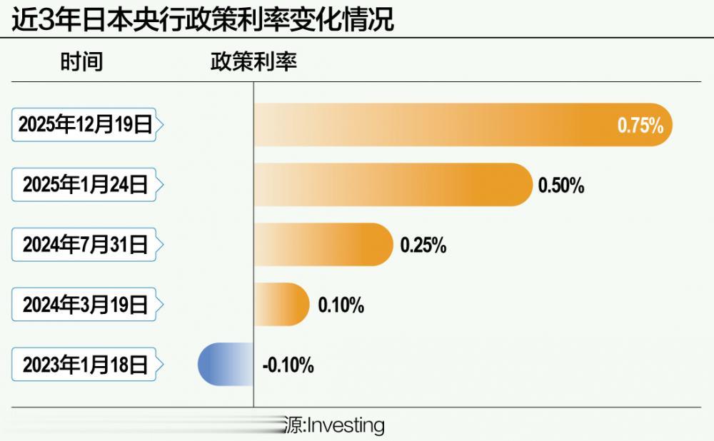 市场的目光纷纷聚焦日本央行2025年内最后一次议息会议。12月19日,日本央行在货币政策会议上通过决议,决定加息25个基点,将政策利率从0.5%上调至0.75%,日本政策利率由此达到30年以来的最高水平。