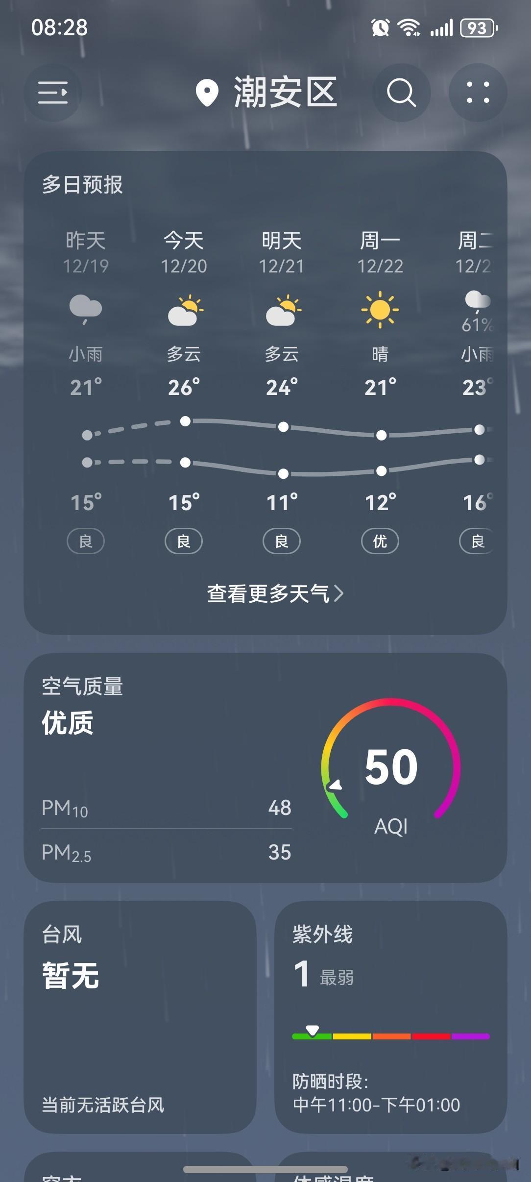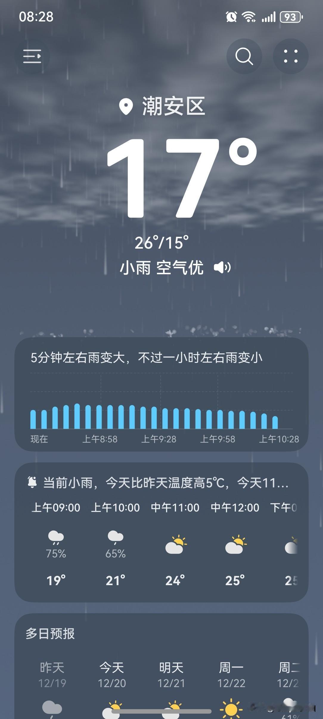 广东晴燥持续防火不能停!20~22日,我省大部多云间晴,局部有小雨。21~22日受北方弱冷空气南下影响,气温小幅下降。 今天(20日),潮州阴天有小雨,气温15~26℃,此刻气温17℃,体感温度16℃。 看看今天的的天空,画风跟昨天相似,云量增多,但又隐约可见阳光,偶然飘落零星小雨,体感有点凉。 明日冬至!看了看天气预报,明天依然暖和,温度还是挺高的,喜提24℃呢! 冷空气即将到货,但对我们这边影响不大,气温也只是下降一点点而已。 这个冬至将是异常暖和的冬至!我们这边向来都是这样,冬至不冷的话,那过年的时候就会很冷,反正一顿冻是跑不了的! 现在天气暖和,那么就接着奏乐接着舞吧! 今天的天气,依然值得一个好评! 如此天气!元芳,你怎么看? [捂脸][我想静静][笑哭][捂脸][我想静静][笑哭][捂脸][我想静静][笑哭]