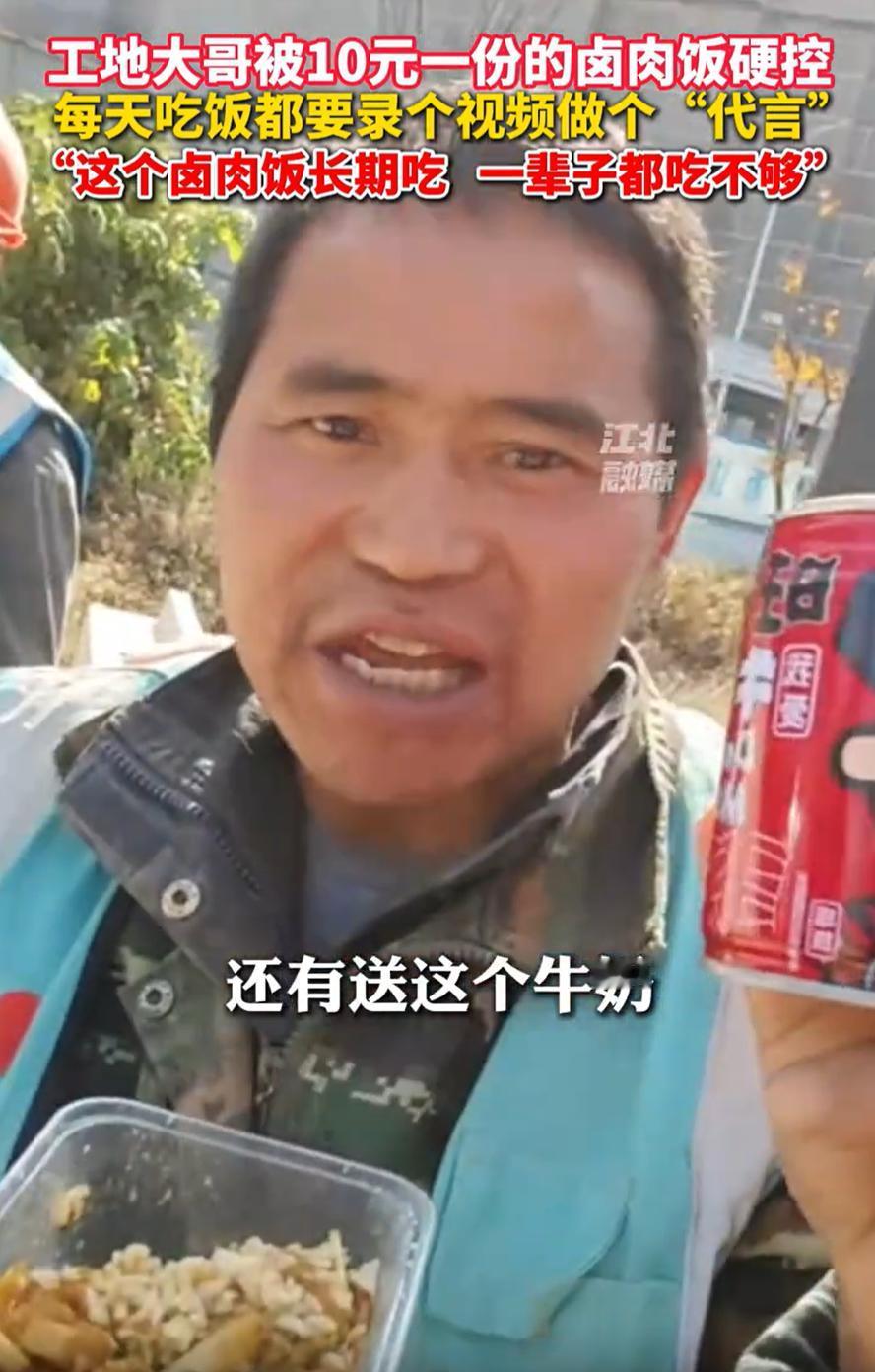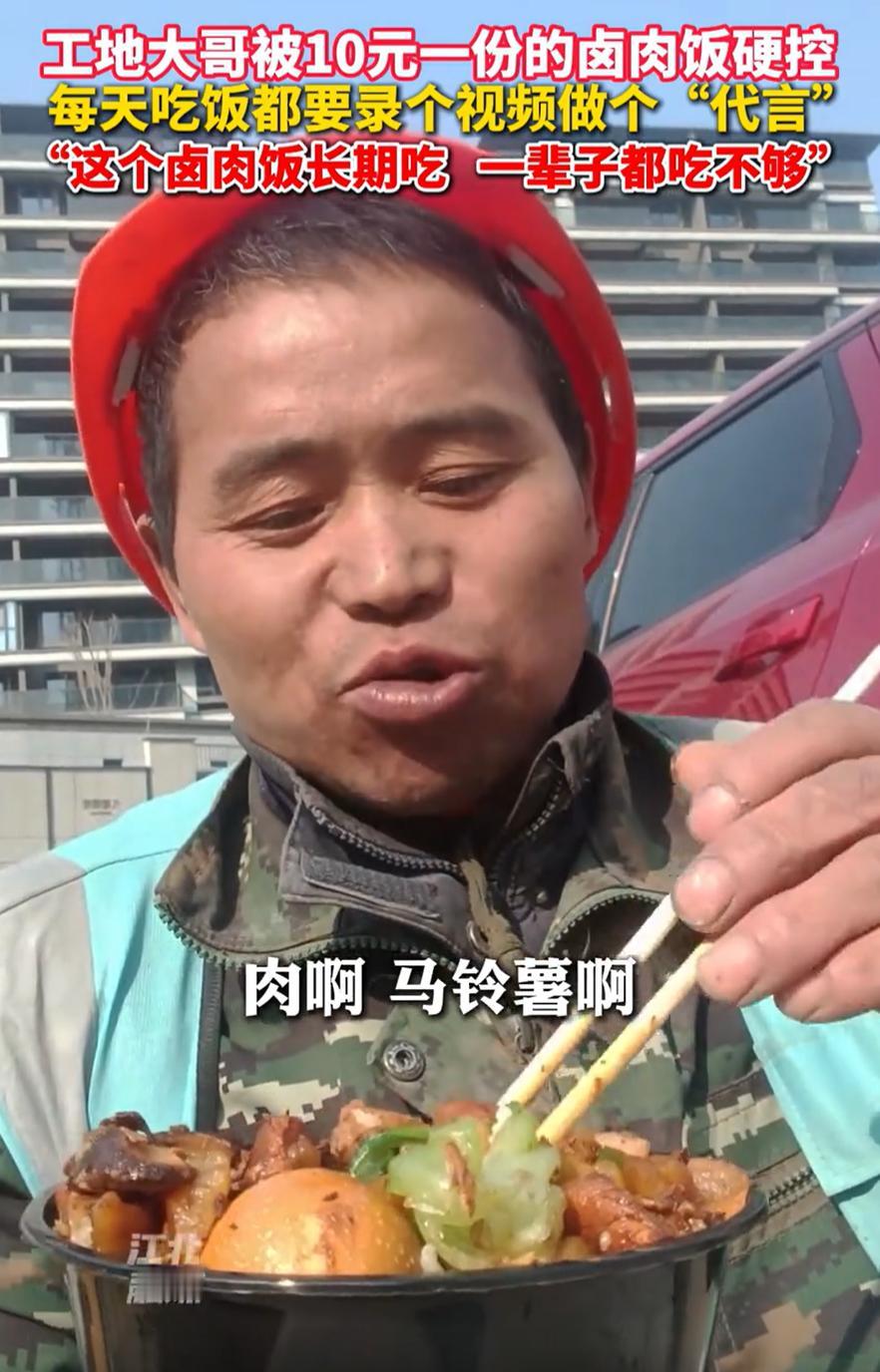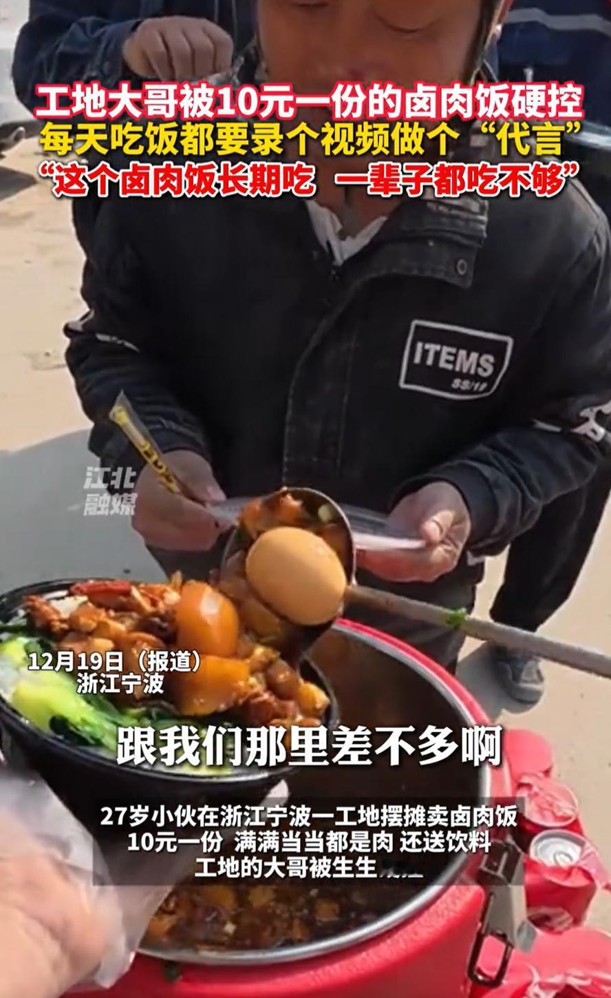 “这简直是在做慈善啊!”浙江宁波,一位27岁小伙在工地附近卖卤肉饭,让人意外的是,一份满满当当的饭菜不卖20,不卖30,竟然只卖10块钱,甚至还送一瓶旺仔牛奶,工人表示:一辈子都吃不够! 从视频来看,小伙每天都会固定在工地附近出摊,10元一份的卤肉饭,碗底是满满的一碗大米饭,然后有卤肉,有卤蛋,还有青菜,更过分的还会送一瓶旺仔牛奶,这已经不是用性价比来形容了,甚至属于“赔本赚吆喝” 而这份卤肉饭,也引起了不少工人的夸赞,其中有工人表示会长期吃,不仅味道好吃,里面菜品也丰富,一辈子都吃不够 有网友算了一笔账:3块一斤的猪肉,1块钱米饭,几毛钱青菜算你5毛,几毛钱鸡蛋算你5毛,4块钱进货的旺仔,3+1+0.5+0.5+4=9,还不算煤气饭盒,你赚啥 如果这么算,确实是不赚钱的,但有一点很多人却忽略掉了,就是小伙子摆摊时,手机常架在一旁,屏幕那头是不断跳动着留言的直播间 他一边打饭,一边和网友聊着天,工地上喧哗的背景声、饭菜升腾的热气、工人们满足的笑脸,都成了直播里鲜活的画面 这样一来,事情就说得通了 摊子上的卤肉饭,看似不赚钱,却为他积累了实实在在的口碑与人气。工地上的工人吃得实惠,屏幕前的观众看得真切,许多人被这份朴实和真诚打动,直播间的人气渐渐聚集。流量带来的关注,或许通过其他方式转化成了收入,比如直播打赏、短视频流量分成,或是未来带货的可能性。对双方来说,这都是一个双赢的局面