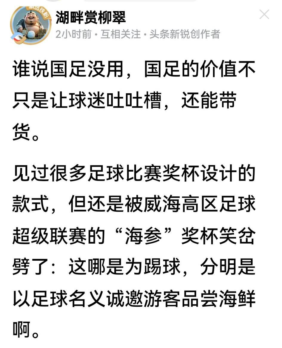 哈哈,看网友转发威海高区超级足球联赛的奖杯设计,真有创意! 海参本是好食材,3年前国足集训期间就以补充能量、增强免疫力。可随后六十多年来首次1:3输给越南,国足就被球迷称为海参队,海参就此躺枪成为背锅的。 现在威海足球比赛用海参造型做奖杯,显然比赛是海参养殖大佬赞助的,想在民间足球中为海参挽回颜面,在大连海参之后抢占足坛一席之地,助力当地海参经济。 我想说,既然有海参队这个梗,威海方面就大大方方请邵佳一把首座奖杯带到国足去,知耻而后勇,也许对国足将士形成强刺激。