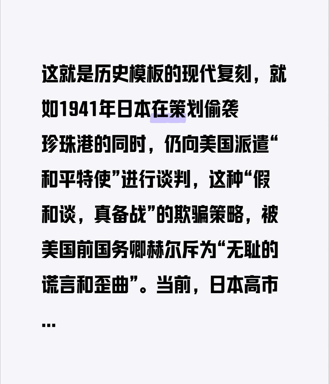 这就是历史模板的现代复刻,就如1941年日本在策划偷袭珍珠港的同时,仍向美国派遣“和平特使”进行谈判,这种“假和谈,真备战”的欺骗策略,被美国前国务卿赫尔斥为“无耻的谎言和歪曲”。当前,日本高市政权在台湾问题上发表严重错误言论后,其国家安保局局长随即向英法德加等国狡辩,称立场未变、中方指责“与事实不符”。这与历史模板高度相似,旨在通过虚假叙事争取战略部署时间并误导国际社会。