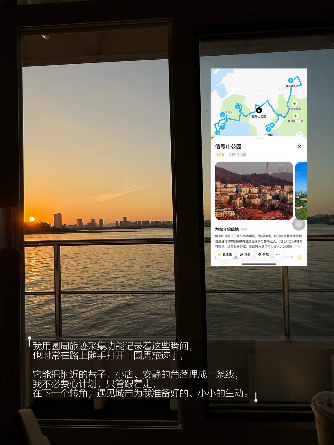 我用圆周旅迹采集功能记录着这些瞬间,也时常在路上随手打开「圆周旅迹」,它能把附近的巷子、小店、安静的角落理成一条线,我不必费心计划,只管跟着走,在下一个转角,遇见城市为我准备好的、小小的生动。