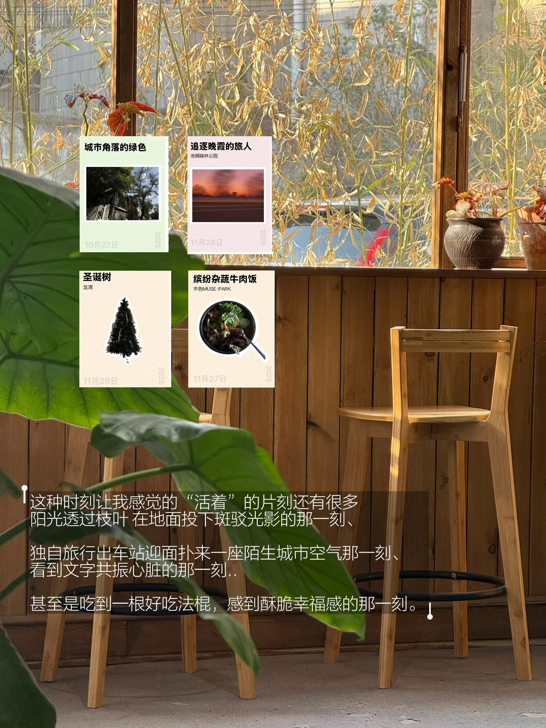阳光透过枝叶 在地面投下斑驳光影的那一刻、独自旅行出车站迎面扑来陌生城市空气那一刻、看到文字共振心脏的那一刻…甚至是吃到一根好吃法棍,感到酥脆幸福感的那一刻。