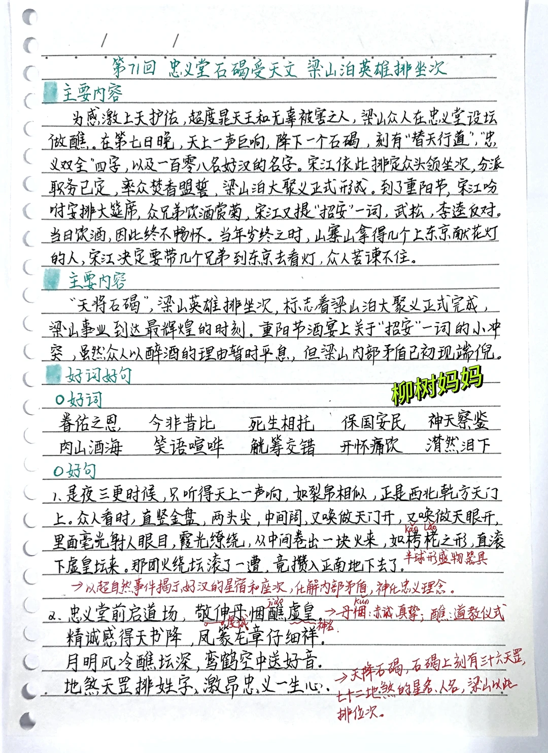《水浒传》第71回 忠义堂石碣受天文 梁山泊英雄排坐次 [清单R][清单R]主要内容 [清单R][清单R]主题思想 [清单R][清单R]好词好句 [清单R][清单R]阅读感悟 梁山泊事业涉及到的是对社会制度的“系统升级”,其复杂性导致在当时环境下是无法做到的,因此梁山英雄的悲剧确实是必然的。作为我们个人成长来讲,我们的“系统升级”就没有那么复杂了,我们可以通过学习开拓视野和思维,通过积极努力将我们获得的更高级的认知付诸行动,从而改变我们的处境,实现自我的“系统升级”。