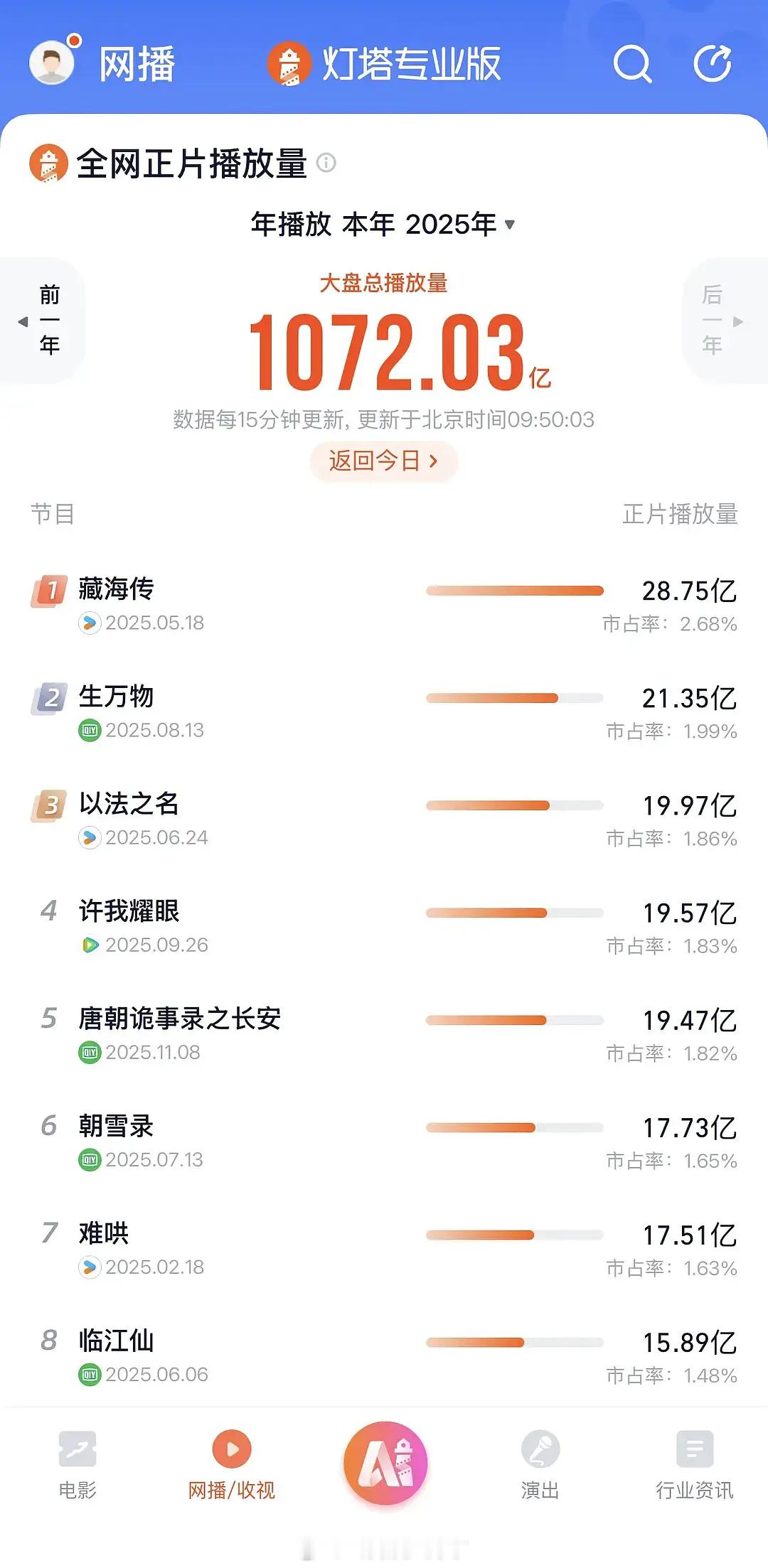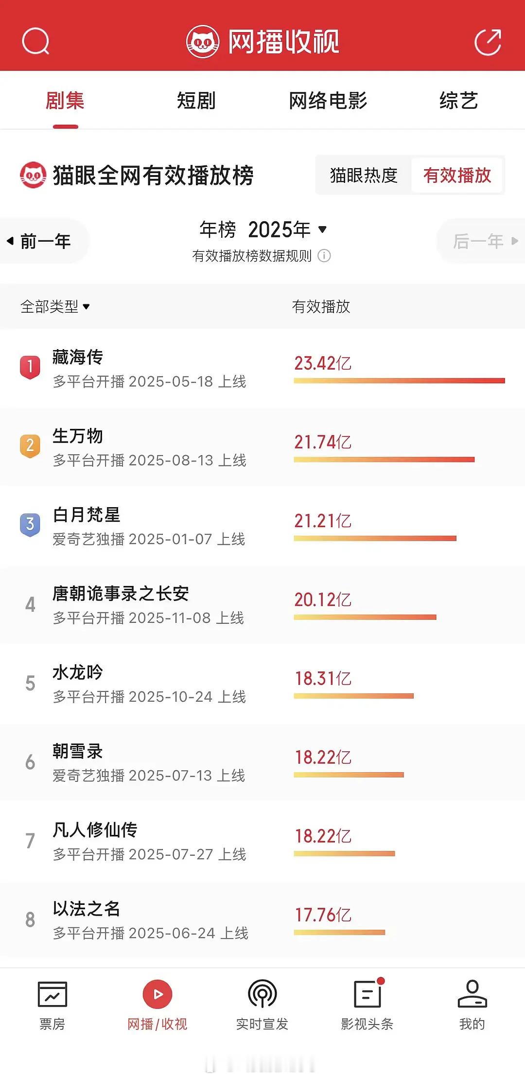《藏海传》是不是可以确定是今年的年冠了!云合、灯塔、猫眼三个平台数据基本已经确定播放量都是年冠了,还有10天不会有什么变化了吧?🤔
