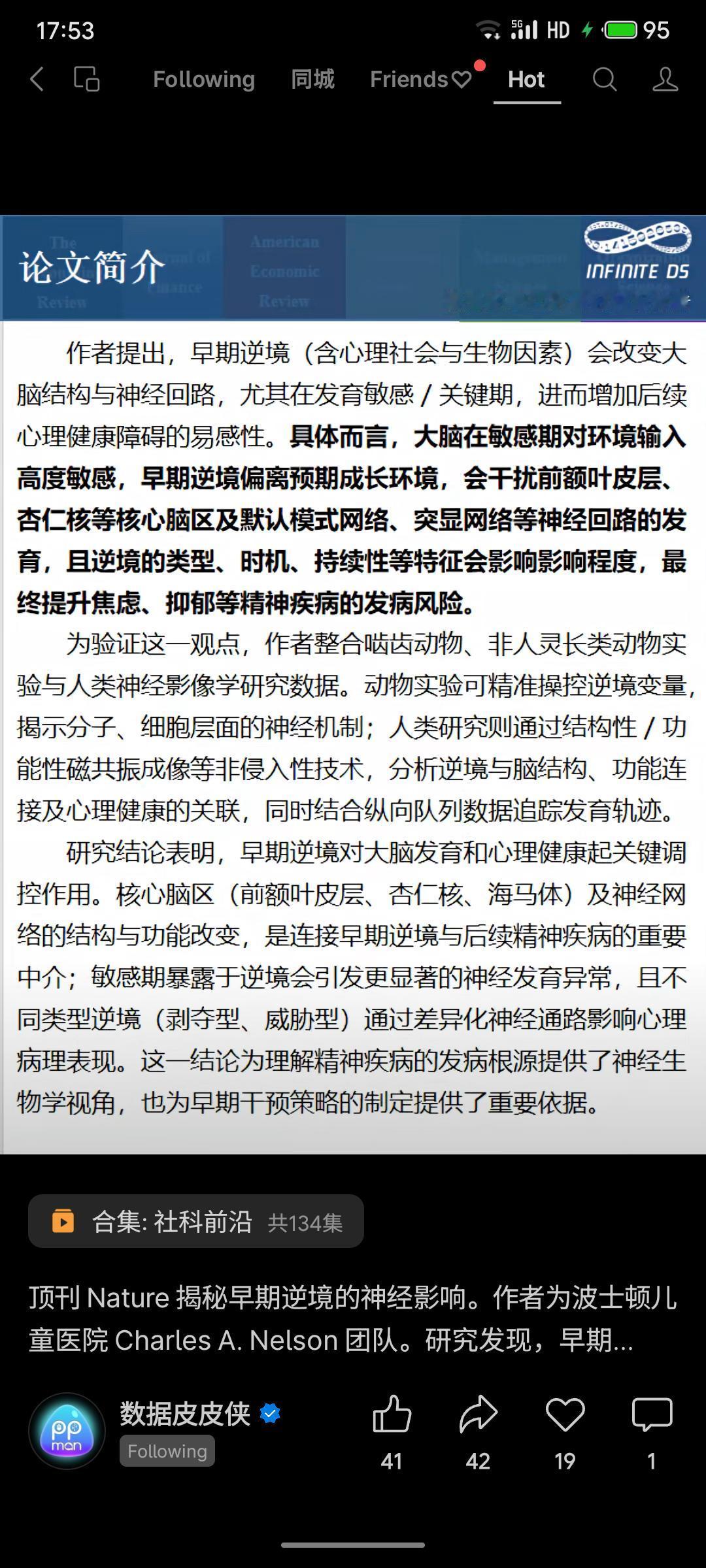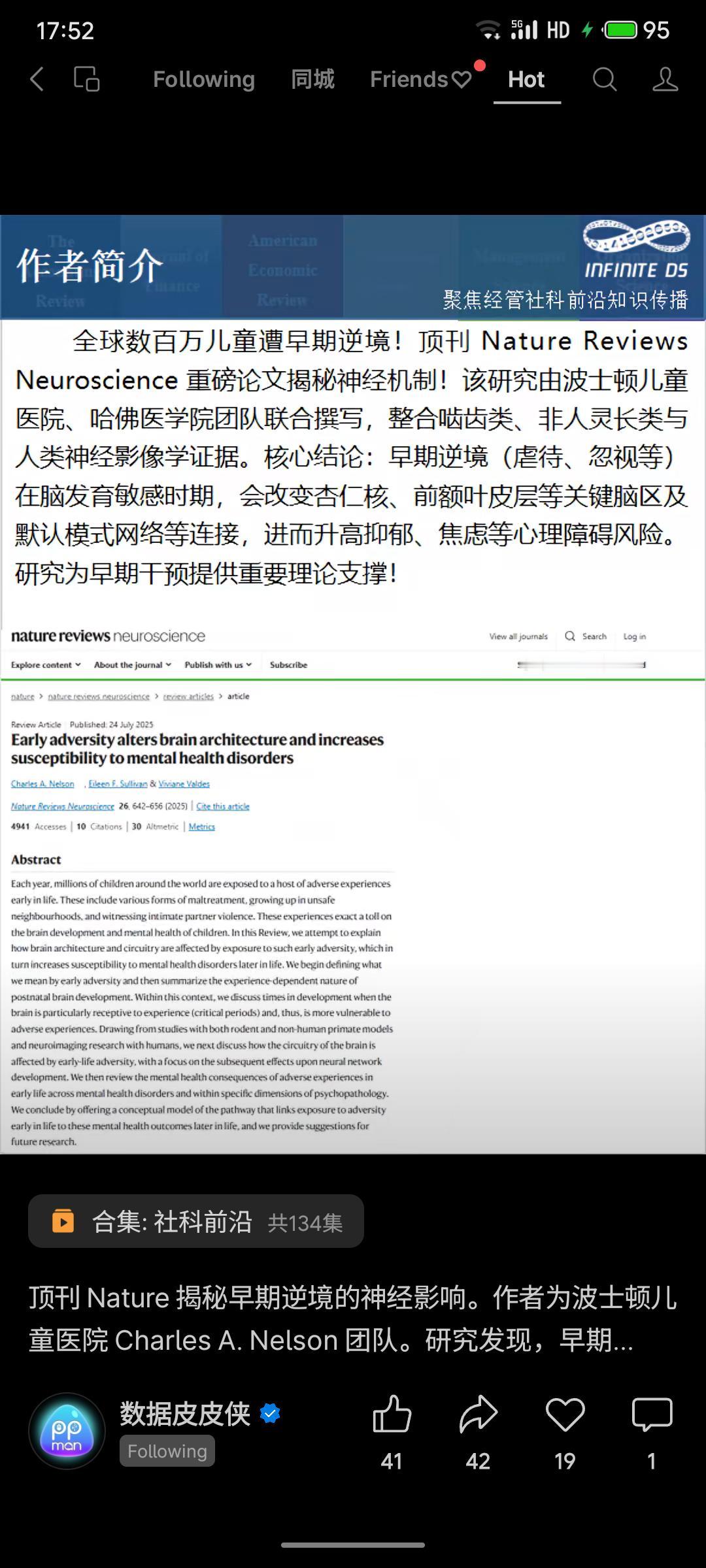 这篇发表于《Nature Reviews Neuroscience》的论文指出,早期逆境(如虐待、忽视)在脑发育敏感期会改变杏仁核、前额叶皮层等关键脑区及神经网络的发育,从而增加后续抑郁、焦虑等心理障碍的风险。研究整合动物与人类神经影像学证据,为早期干预提供了理论依据。