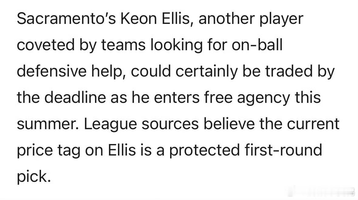 爆料!据有意鹈鹕琼斯后,湖人把目前转向了国王外线大锁!根据Dan Woike表示:湖人在交易截止日之前考虑引援的目标人选是:基恩埃利斯。这位被多支寻求持球防守补强的球队觊觎的球员,很可能在交易截止日前被送走,因为他即将在今年夏天成为自由球员。据联盟消息人士透露,目前埃利斯的交易要价为一个受保护的首轮选秀权。不过"他可能是联盟中最受争议的球员之一。"一位联盟内部人士指出,尽管几乎所有对手球队的球探都对他赞誉有加,不过埃利斯被连续两任教练组都未给他足够的上场机会!虽然埃利斯具备可靠的投射能力(职业生涯三分命中率42%),但防守端的实际影响力仍是赌注所在。部分观点认为,埃利斯更擅长制造失误,而非真正限制对手进攻。对他评价较低的人则担忧其身材条件,认为他难以防守体型更大的后卫。尽管如此,他看起来仍是湖人在本交易季会考虑的目标——当然,追逐他的球队不会只有湖人一家。目前他场均5.5分1.4篮板1.4抢断三分命中率35.6%,而此前湖人就想用克内克特加一次轮去换他!他的薪资是230万美元!原本在上赛季他打得很出色,各项数都是生涯新高,但是本赛季国王不知道咋了,不用他了!那就来湖人吧,仅25岁符合湖人想交易30岁以下的思路!身高193cm体重79kg的他,不比克内克特差!虽然他的防守可能没有想象中那么好,但是我看过他打球,极具大心脏!湖人湖人国度洛杉矶湖人埃利斯国王